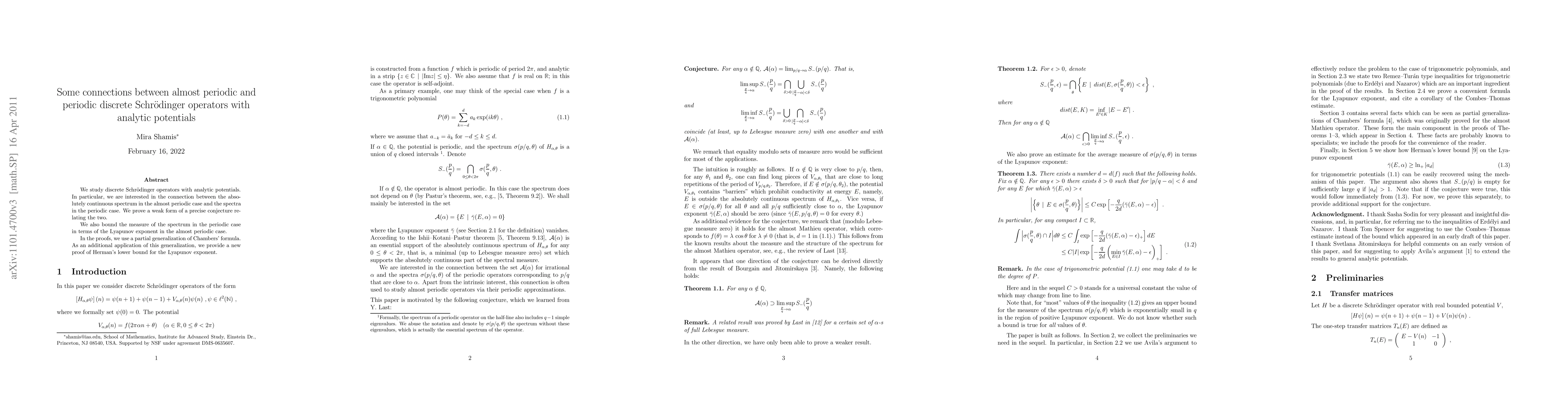 We study discrete Schroedinger operators with analytic potentials. In particular, we are interested in the connection between the absolutely continuous spectrum in the almost periodic case and the spectra in the periodic case. We prove a weak form of a precise conjecture relating the two. We also bound the measure of the spectrum in the periodic case in terms of the Lyapunov exponent in the almost periodic case. In the proofs, we use a partial generalization of Chambers' formula. As an additional application of this generalization, we provide a new proof of Herman's lower bound for the Lyapunov exponent.