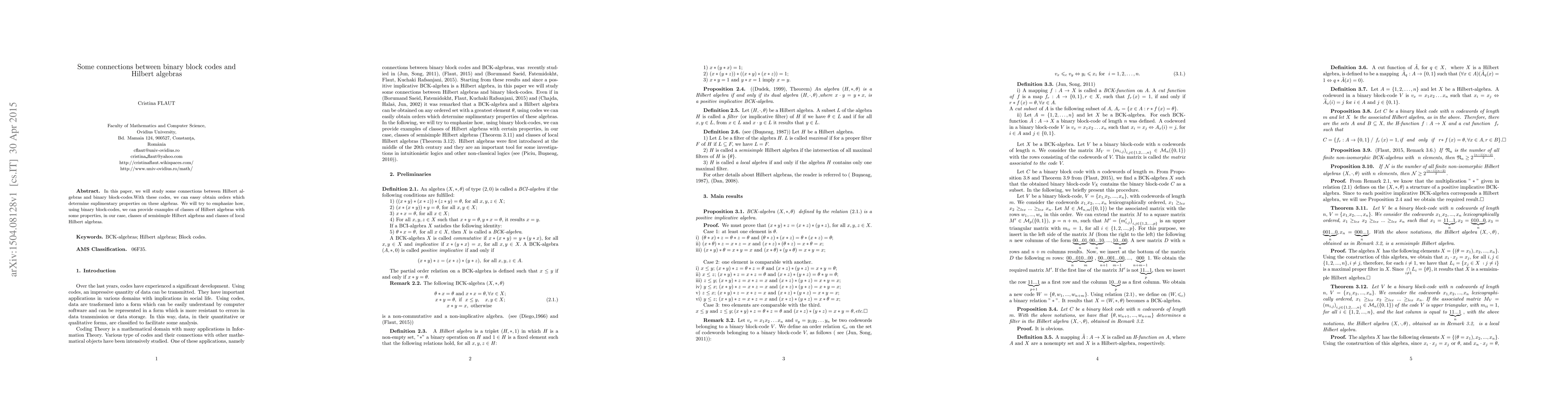 In this paper, we will study some connections between Hilbert al- gebras and binary block-codes.With these codes, we can eassy obtain orders which determine suplimentary properties on these algebras. We will try to emphasize how, using binary block-codes, we can provide examples of classes of Hilbert algebras with some properties, in our case, classes of semisimple Hilbert algebras and classes of local Hilbert algebras.
