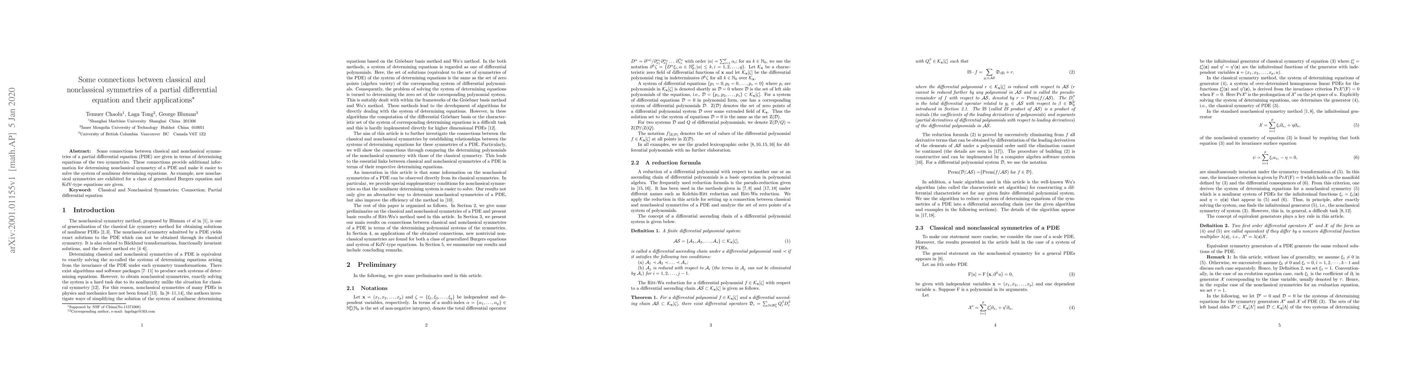 This paper explores the connections between classical and nonclassical symmetries of partial differential equations (PDEs), offering insights that simplify the determination of nonclassical symmetries. It demonstrates these connections through examples of generalized Burgers and KdV-type equations, revealing new nonclassical symmetries.