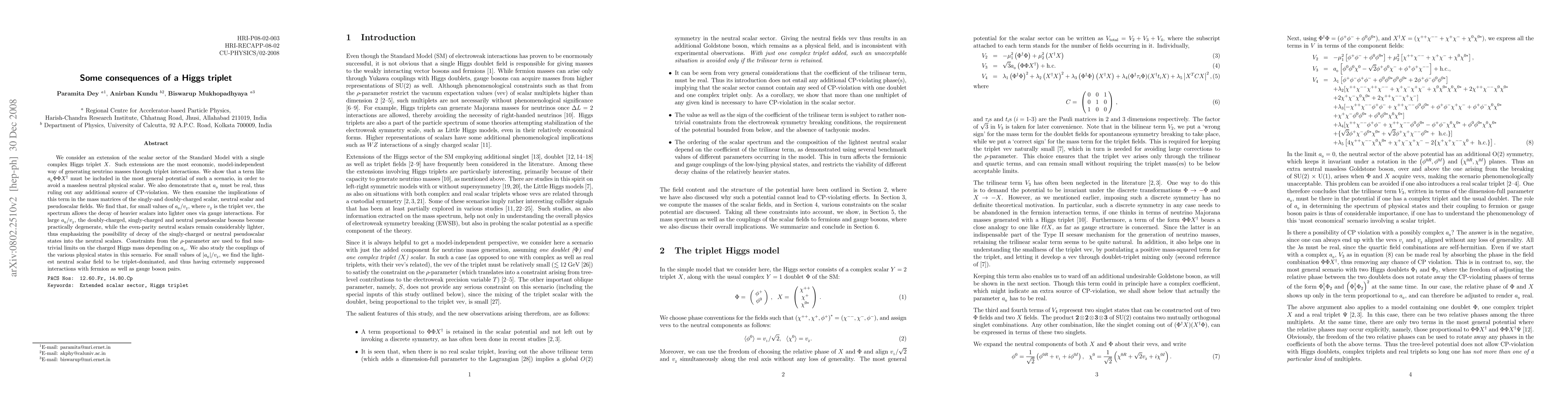 We consider an extension of the scalar sector of the Standard Model with a single complex Higgs triplet $X$. Such extensions are the most economic, model-independent way of generating neutrino masses through triplet interactions. We show that a term like $\azero\Phi\Phi X^\dag$ must be included in the most general potential of such a scenario, in order to avoid a massless neutral physical scalar. We also demonstrate that $\azero$ must be real, thus ruling out any additional source of CP-violation. We then examine the implications of this term in the mass matrices of the singly-and doubly-charged scalar, neutral scalar and pseudoscalar fields. We find that, for small values of $\azero/\vtwo$, where $\vtwo$ is the triplet vev, the spectrum allows the decay of heavier scalars into lighter ones via gauge interactions. For large $\azero/\vtwo$, the doubly-charged, singly-charged and neutral pseudoscalar bosons become practically degenerate, while the even-parity neutral scalars remain considerably lighter, thus emphasizing the possibility of decay of the singly-charged or neutral pseudoscalar states into the neutral scalars. Constraints from the $\rho$-parameter are used to find nontrivial limits on the charged Higgs mass depending on $\azero$. We also study the couplings of the various physical states in this scenario. For small values of $|\azero|/\vtwo$, we find the lightest neutral scalar field to be triplet-dominated, and thus having extremely suppressed interactions with fermion as well as gauge boson pairs.