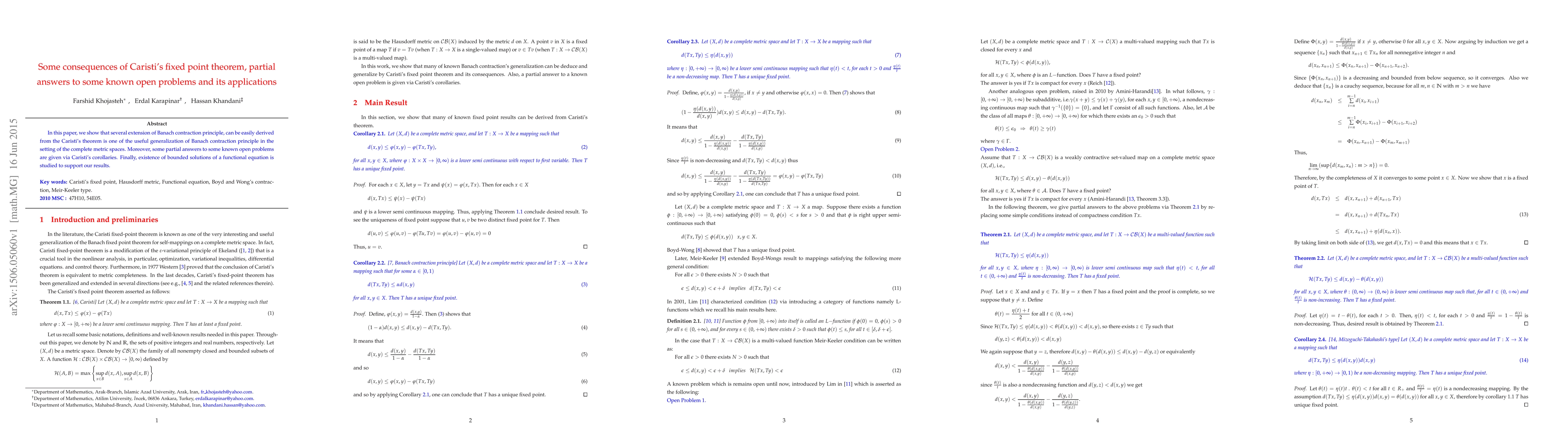 In this paper, we show that several extension of Banach contraction principle, can be easily derived from the Caristi's theorem is one of the useful generalization of Banach contraction principle in the setting of the complete metric spaces. Moreover, some partial answers to some known open problems are given via Caristi's corollaries. Finally, existence of bounded solutions of a functional equation is studied to support our results.