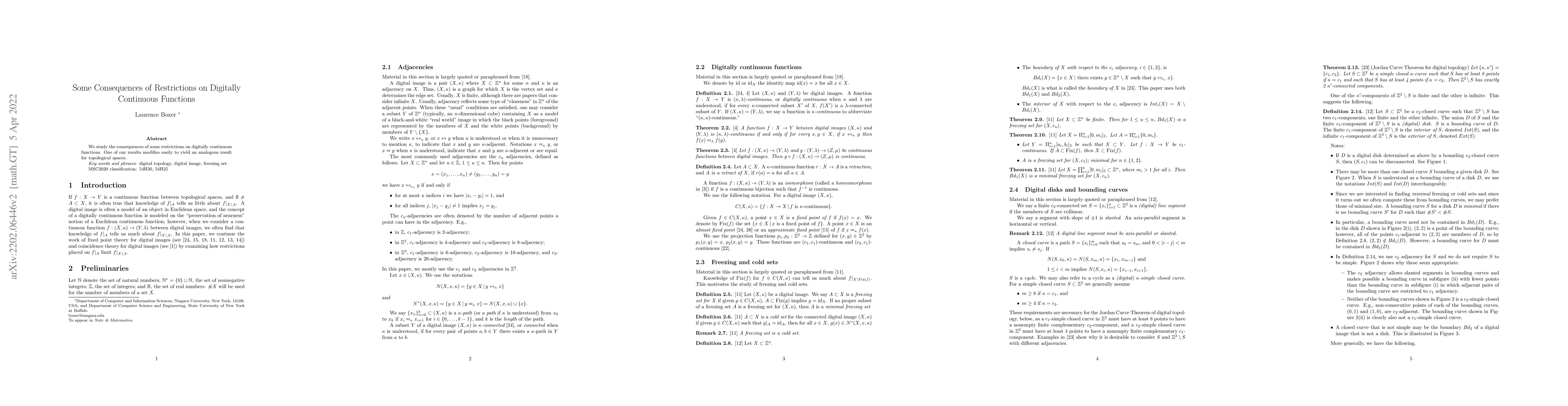 Two-line summary: This paper investigates the impact of restrictions on digitally continuous functions and demonstrates a corresponding result for topological spaces. The findings provide insight into the behavior of such functions under various constraints.
