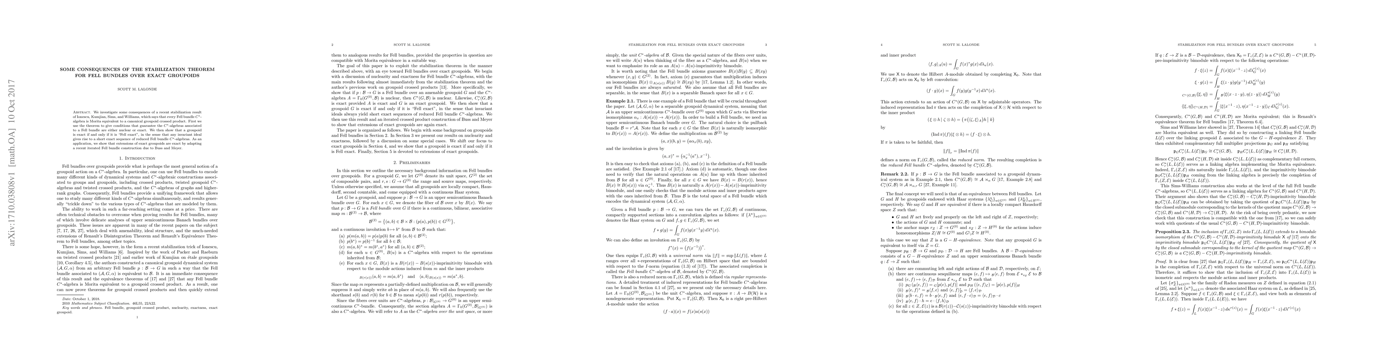 This paper explores the consequences of a stabilization theorem for Fell bundles over exact groupoids, proving conditions for nuclearity or exactness of associated $C^*$-algebras and demonstrating that exact groupoids are "Fell exact". It concludes by showing that extensions of exact groupoids remain exact using an adapted iterated Fell bundle construction.