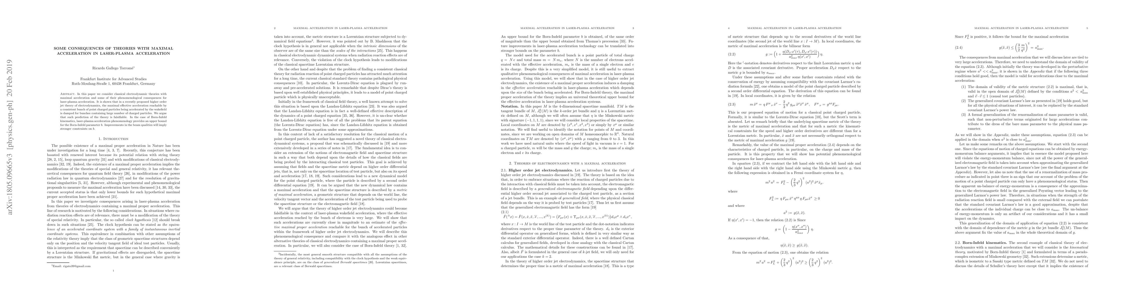 In this paper we consider classical electrodynamic theories with maximal acceleration and some of their phenomenological consequences for laser-plasma acceleration. It is shown that in a recently proposed higher order jet theory of electrodynamics, the maximal effective acceleration reachable by a consistent bunch of point charged particles being accelerated by the wakefield is damped for bunches containing large number of charged particles. We argue that such prediction of the theory is falsifiable. In the case of Born-Infeld kinematics, laser-plasma acceleration phenomenology provides an upper bound for the Born-Infeld parameter $b$. Improvements in the beam qualities will imply stronger constraints on $b$.