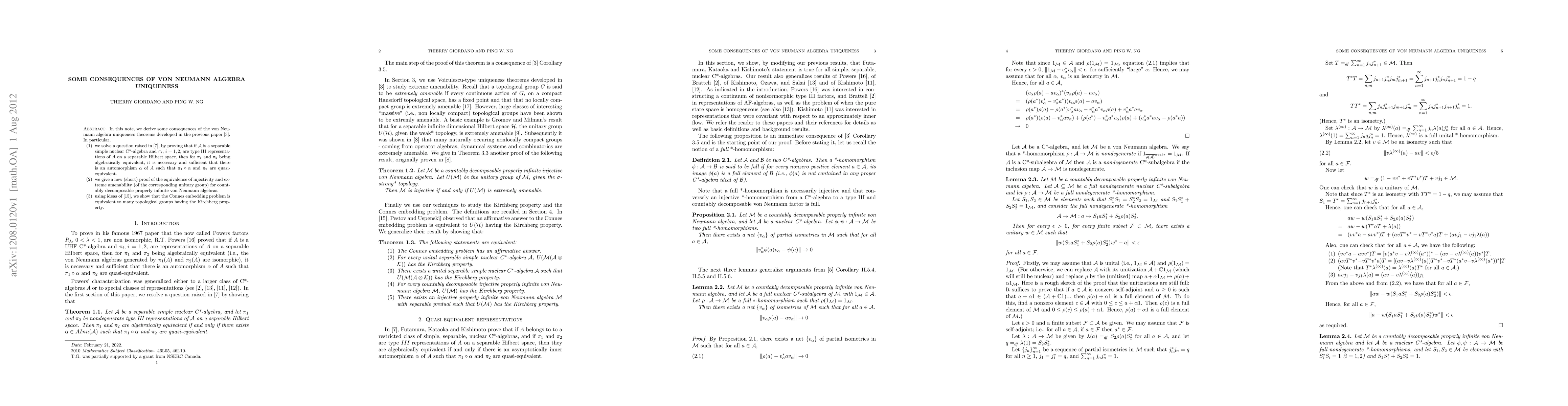 In this note, we derive some consequences of the von Neumann algebra uniqueness theorems developed in a previous paper (see arXiv:1207.6741v1). In particular, 1) we solvein a paper of Futamura, Kataoka, and Kishimoto, by proving that if A is a separable simple nuclear C*-algebra and for \pi_1 and \pi_2 are type III representations of A on a separable Hilbert space, then for \pi_1 and \pi_2 being algebraically equivalent, it is necessary and sufficient that there is an automorphism \alpha of A such that \pi_1 composed with \alpha, and \pi_2 are quasi-equivalent. 2) we give a new (short) proof of the equivalence of injectivity and extreme amenability (of the corresponding unitary group) for countably decomposable properly infinite von Neumann algebras. 3) using ideas of Pestov, we show that the Connes embedding problem is equivalent to many topological groups having the Kirchberg property.