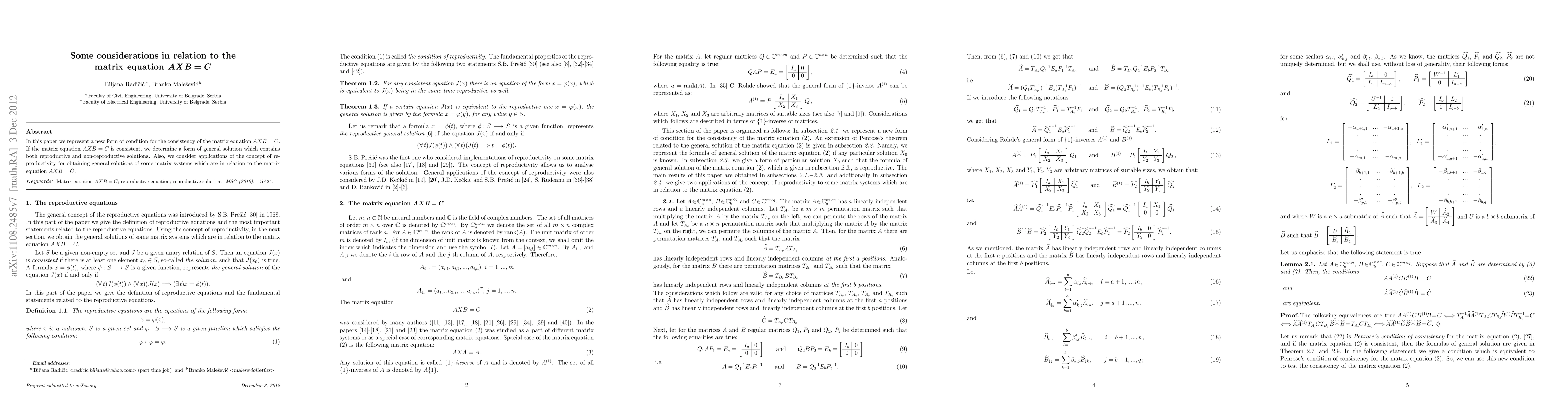 This paper introduces a new condition for the consistency of the matrix equation AXB=C and provides a general solution that includes both reproductive and non-reproductive solutions. It also explores applications of reproductivity in solving related matrix systems.