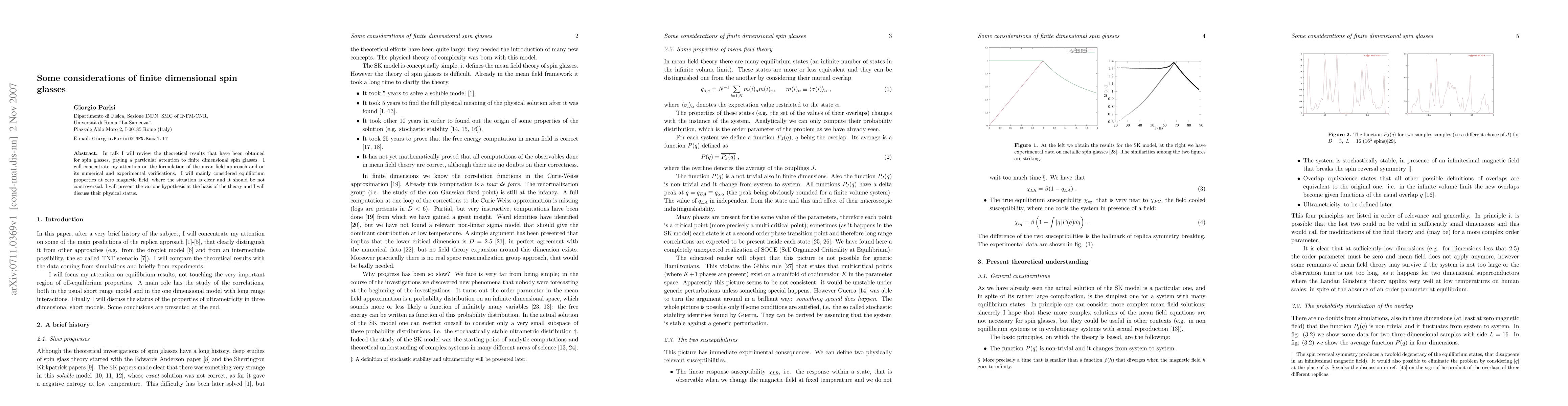 In talk I will review the theoretical results that have been obtained for spin glasses, paying a particular attention to finite dimensional spin glasses. I will concentrate my attention on the formulation of the mean field approach and on its numerical and experimental verifications. I will mainly considered equilibrium properties at zero magnetic field, where the situation is clear and it should be not controversial. I will present the various hypothesis at the basis of the theory and I will discuss their physical status.