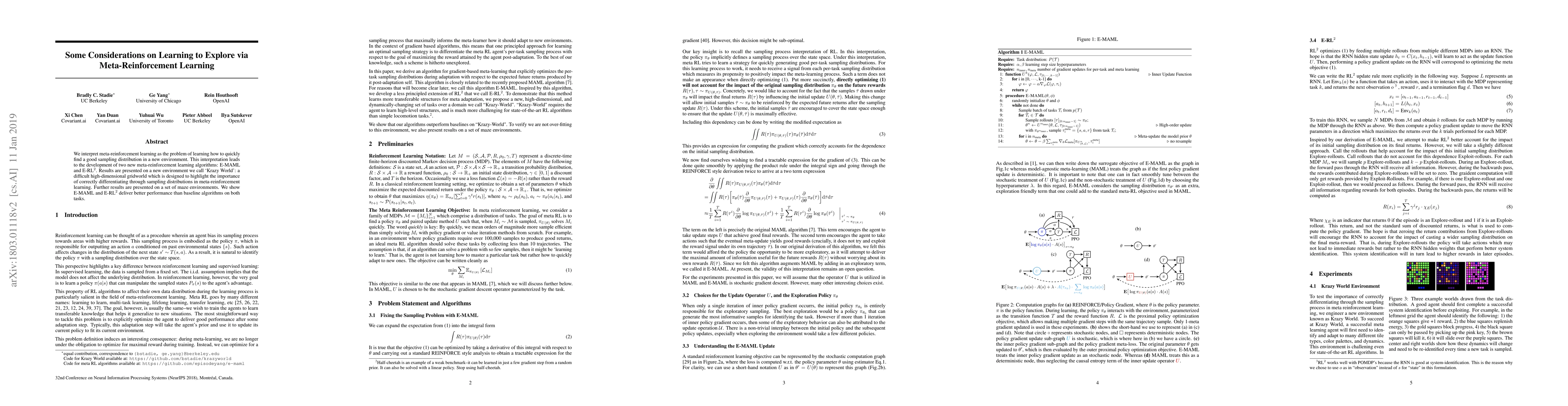 We consider the problem of exploration in meta reinforcement learning. Two new meta reinforcement learning algorithms are suggested: E-MAML and E-$\text{RL}^2$. Results are presented on a novel environment we call `Krazy World' and a set of maze environments. We show E-MAML and E-$\text{RL}^2$ deliver better performance on tasks where exploration is important.