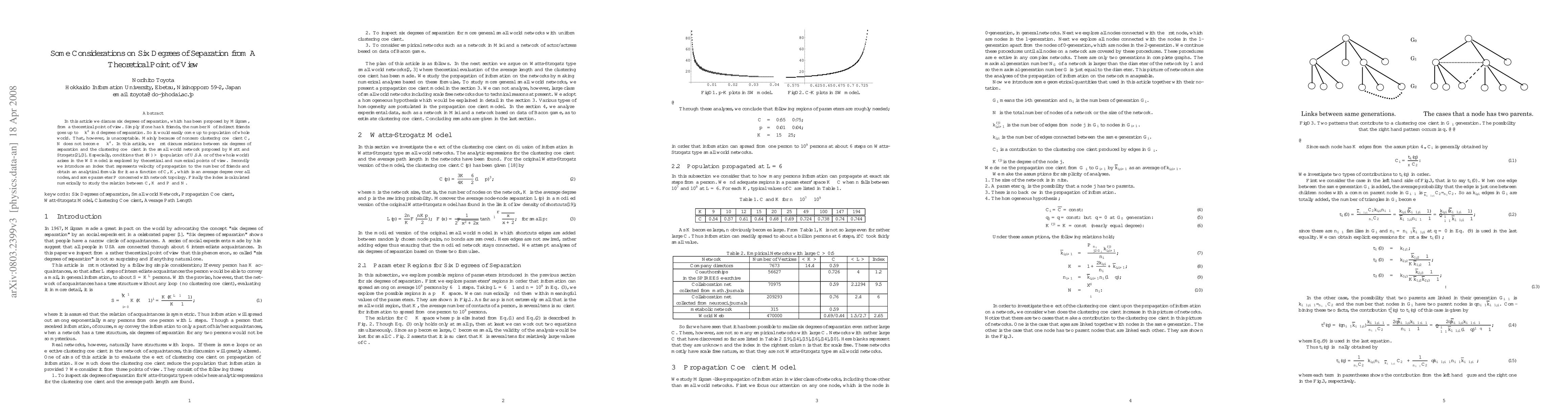 In this article we discuss six degrees of separation, which has been proposed by Milgram, from a theoretical point of view. Simply if one has $k$ friends, the number $N$ of indirect friends goes up to $\sim k^d$ in $d$ degrees of separation. So it would easily come up to population of whole world. That, however, is unacceptable. Mainly because of nonzero clustering coefficient $C$, $N$ does not become $\sim k^d$. In this article, we first discuss relations between six degrees of separation and the clustering coefficient in the small world network proposed by Watt and Strogatz\cite{Watt1},\cite{Watt2}. Especially, conditions that $(N)>$ (population of U.S.A or of the whole world) arises in the WS model is explored by theoretical and numerical points of view. Secondly we introduce an index that represents velocity of propagation to the number of friends and obtain an analytical formula for it as a function of $C$, $K$, which is an average degree over all nodes, and some parameter $P$ concerned with network topology. Finally the index is calculated numerically to study the relation between $C$, $K$ and $P$ and $N$.
