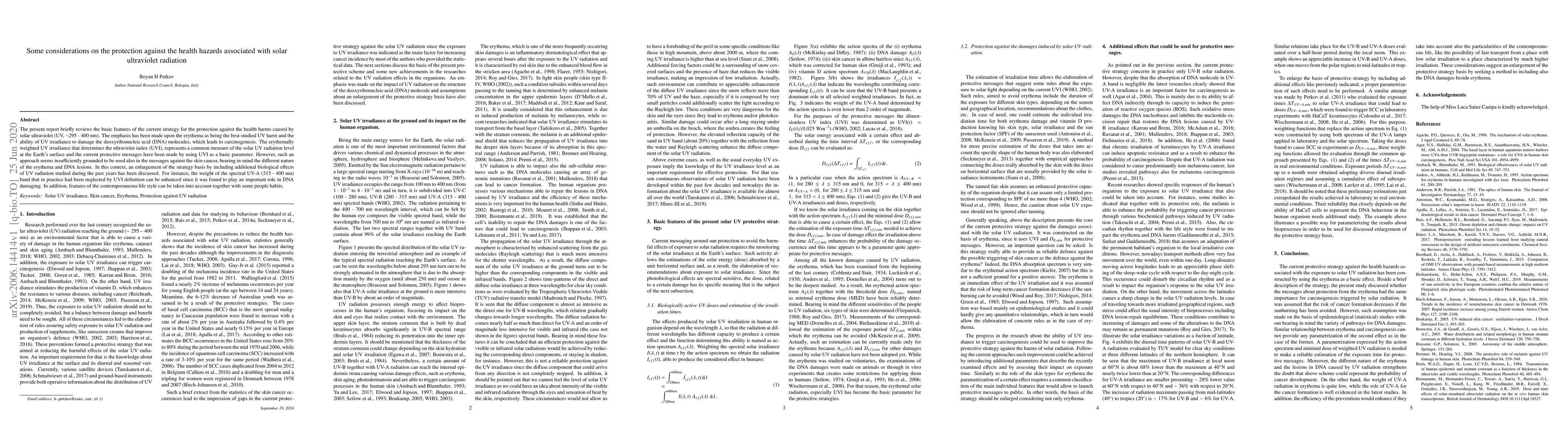 The present report briefly reviews the basic features of the current strategy for the protection against the health harms caused by solar ultraviolet (UV, 295 - 400 nm). The emphasis has been made upon the erythema as being the best-studied UV harm and the ability of UV irradiance to damage the deoxyribonucleic acid (DNA) molecules, which leads to carcinogenesis. The erythemally weighted UV irradiance that determines the ultraviolet index (UVI), represents a common measure of the solar UV radiation level at the Earth's surface and the current protective messages have been made by using UVI as a basic parameter. However, such an approach seems insufficiently grounded to be used also in the messages against the skin cancer, bearing in mind the different nature of the erythema and DNA lesions. In this context, an enlargement of the strategy basis by including additional biological effects of UV radiation studied during the past years has been discussed. For instance, the weight of the spectral UV-A (315 - 400 nm) band that in practice had been neglected by UVI definition can be enhanced since it was found to play an important role in DNA damaging. In addition, features of the contemporaneous life style can be taken into account together with some people habits.