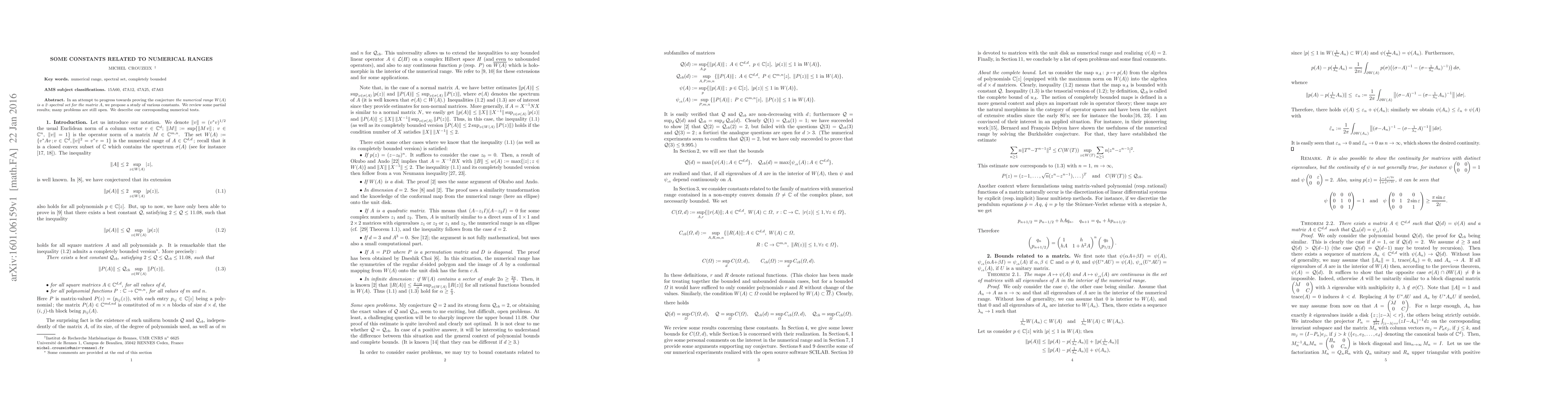 This paper explores constants linked to numerical ranges to advance the conjecture that W(A) is a 2--spectral set for matrix A. It reviews existing results, presents unsolved problems, and details corresponding numerical tests.