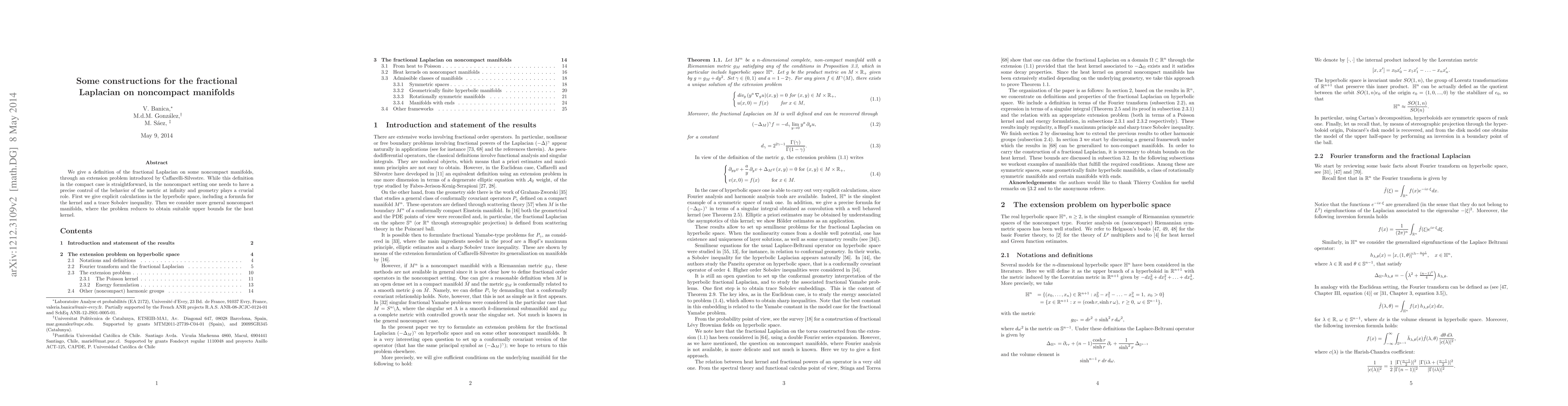 This paper defines the fractional Laplacian on noncompact manifolds via an extension problem, emphasizing the importance of the metric's behavior at infinity. It provides explicit calculations for hyperbolic space and discusses obtaining upper bounds for the heat kernel on more general noncompact manifolds.