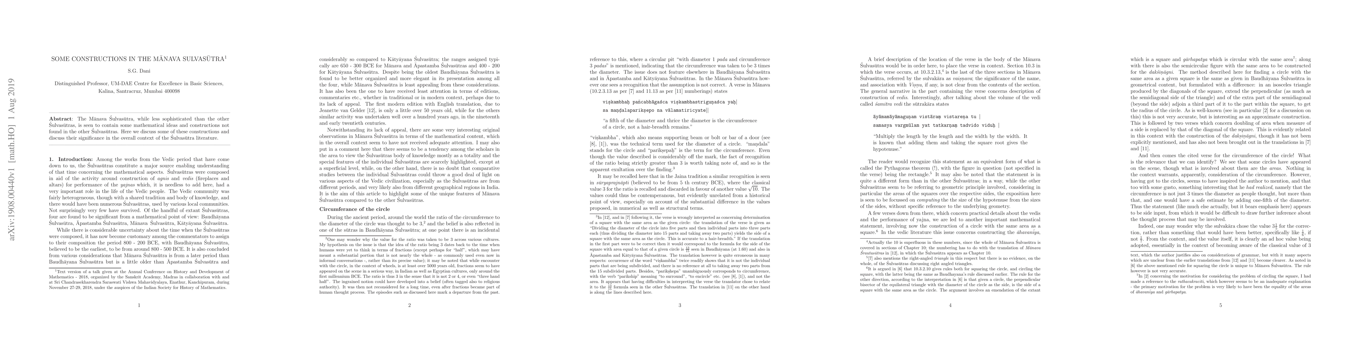 The M\=anava \'Sulvas\=utra, while less sophisticated than the other \'sulvas\=utras, is seen to contain some mathematical ideas and constructions not found in the other \'sulvas\=utras. Here we discuss some of these constructions and discuss their significance in the overall context of the \'sulvas\=utra literature.