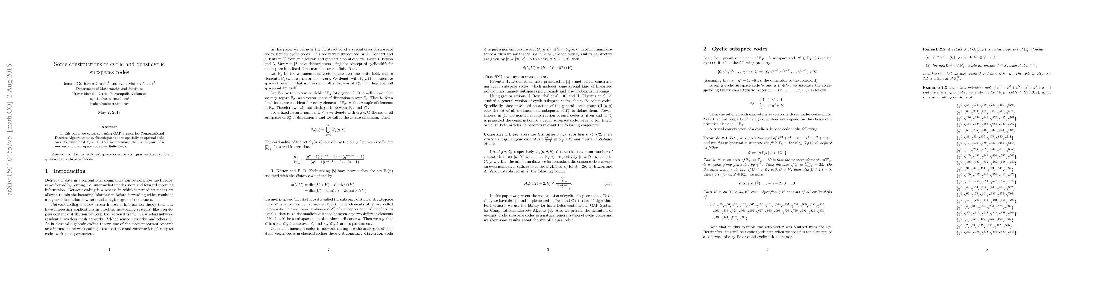 In this paper we construct, using GAP System for Computational Discrete Algebra, some cyclic subspace codes, specially an optimal code over the finite field F_{2^{10}}. Further we present a definition and an example of the $q$-analogous of a $m$-quasi-cyclic subspace code over F_{2^{8}}.