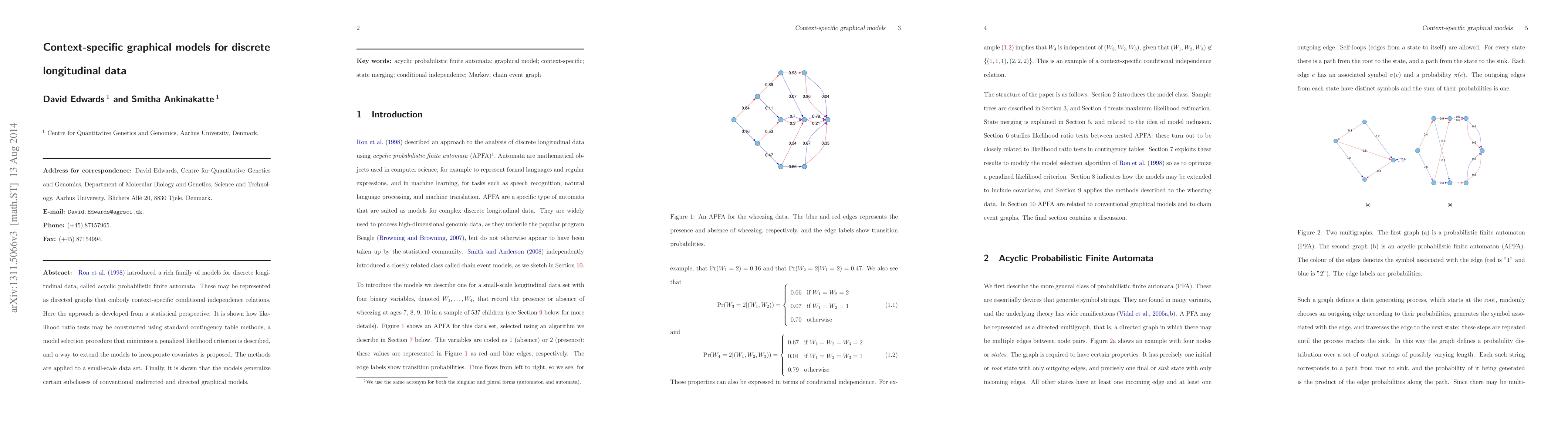 Ron et al (1998) introduced a rich family of models for discrete longitudinal data, called acyclic probabilistic finite automata. These may be described as context-specific graphical models, since they are represented as directed multigraphs that embody context-specific conditional independence relations. Here we develop the methodology from a statistical modelling perspective. We show how likelihood ratio tests may be constructed using standard contingency table methods, and indicate how these may be used in model selection. We also show that the models generalize certain subclasses of conventional undirected and directed graphical models.