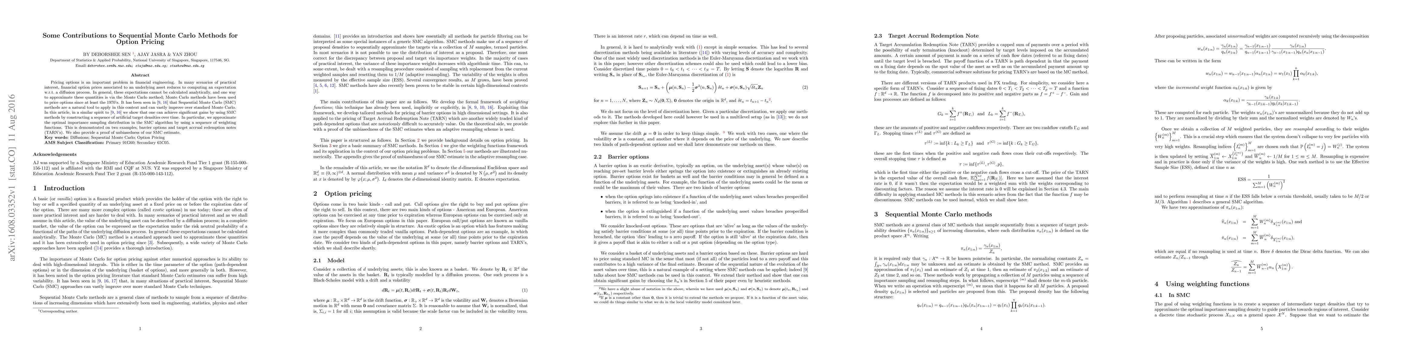 This paper explores the application of Sequential Monte Carlo (SMC) methods for option pricing, demonstrating significant improvements over standard Monte Carlo methods. It constructs a sequence of artificial target densities to approximate the optimal importance sampling distribution, showcasing its effectiveness on barrier options and target accrual redemption notes (TARNs), and provides a proof of unbiasedness for the SMC estimate.