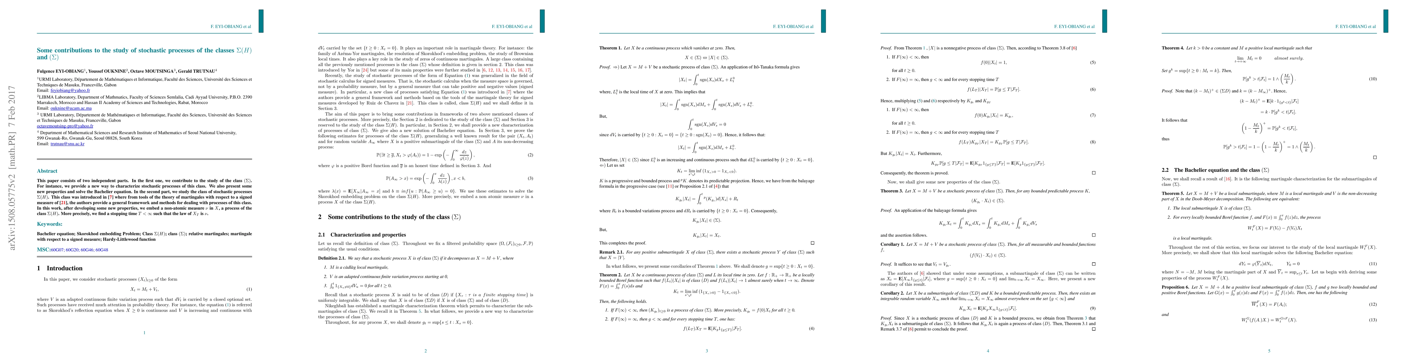 This paper explores two classes of stochastic processes: $(\Sigma)$ and $\Sigma(H)$. It introduces new characterizations and properties of $(\Sigma)$ and solves the Bachelier equation. For $\Sigma(H)$, it develops new properties and embeds a non-atomic measure $\nu$ into the process $X$, finding a stopping time $T$ such that $X_T$ follows $\nu$.