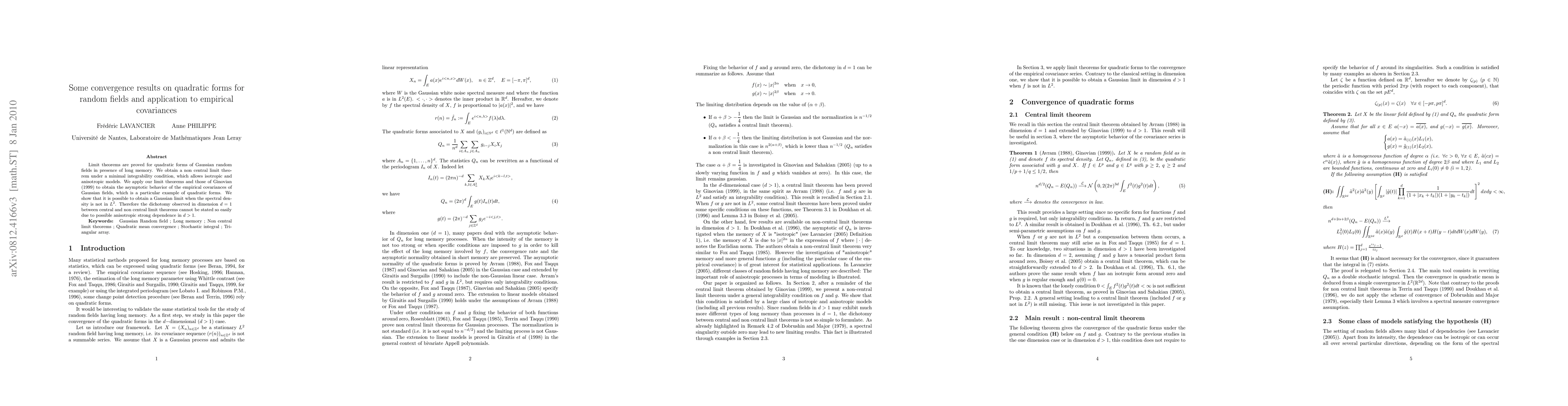 This paper proves limit theorems for quadratic forms of Gaussian random fields with long memory, deriving a non-central limit theorem applicable to both isotropic and anisotropic models. It extends these results to analyze the asymptotic behavior of empirical covariances, showing a Gaussian limit even when the spectral density is not in $L^2$, thus challenging the dichotomy observed in one dimension for higher dimensions.