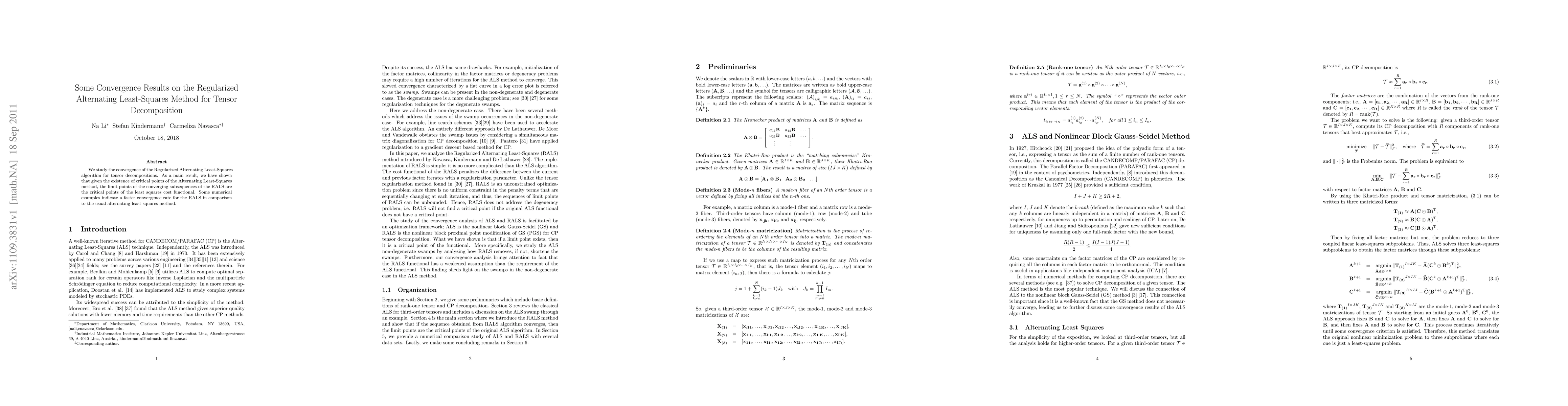 This paper investigates the convergence properties of the Regularized Alternating Least-Squares (RALS) method for tensor decomposition, proving that its converging subsequences reach critical points of the least squares cost functional. Numerical results suggest that RALS exhibits a faster convergence rate than the standard alternating least squares method.