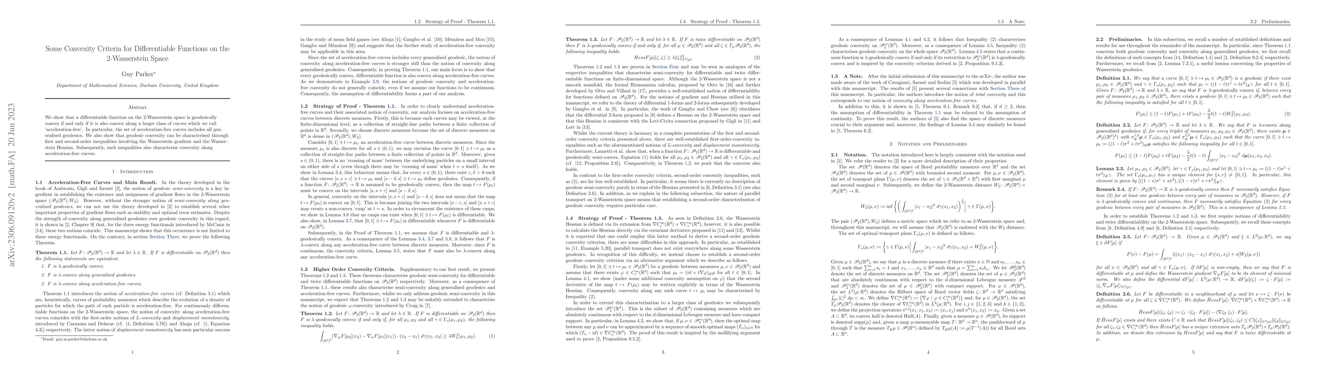 This paper establishes that geodesic convexity on the 2-Wasserstein space is equivalent to convexity along acceleration-free curves, which encompass all generalised geodesics. It also introduces first and second-order inequalities involving the Wasserstein gradient and Hessian to characterise both geodesic and acceleration-free convexity.