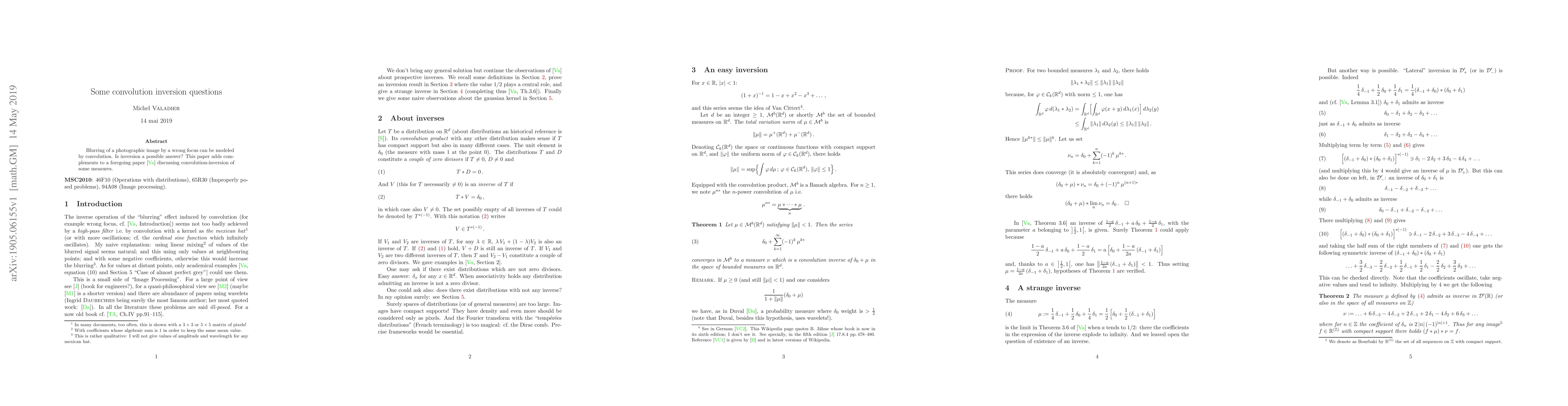 The paper discusses convolution inversion questions, specifically focusing on the inversion of measures in R^d. It introduces a theorem that provides a series representation for the inverse of a measure under certain conditions.