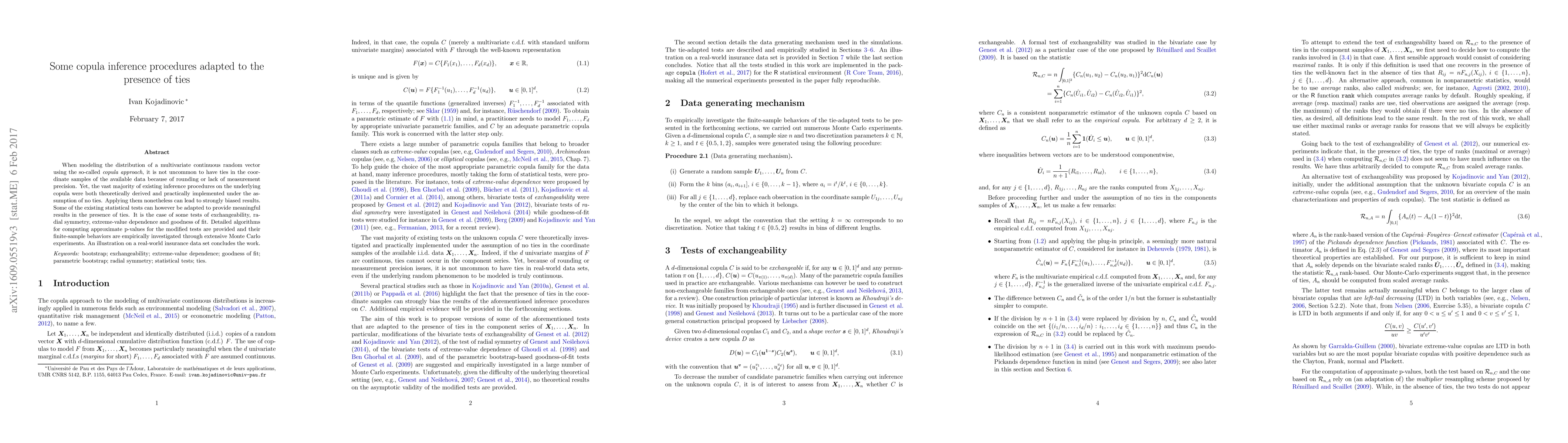 This paper proposes adapted inference procedures for copulas when data contains ties, addressing the bias from existing methods that assume no ties. It provides modified tests for exchangeability, radial symmetry, extreme-value dependence, and goodness of fit, along with algorithms for computing p-values and validates them through Monte Carlo simulations and an application to insurance data.