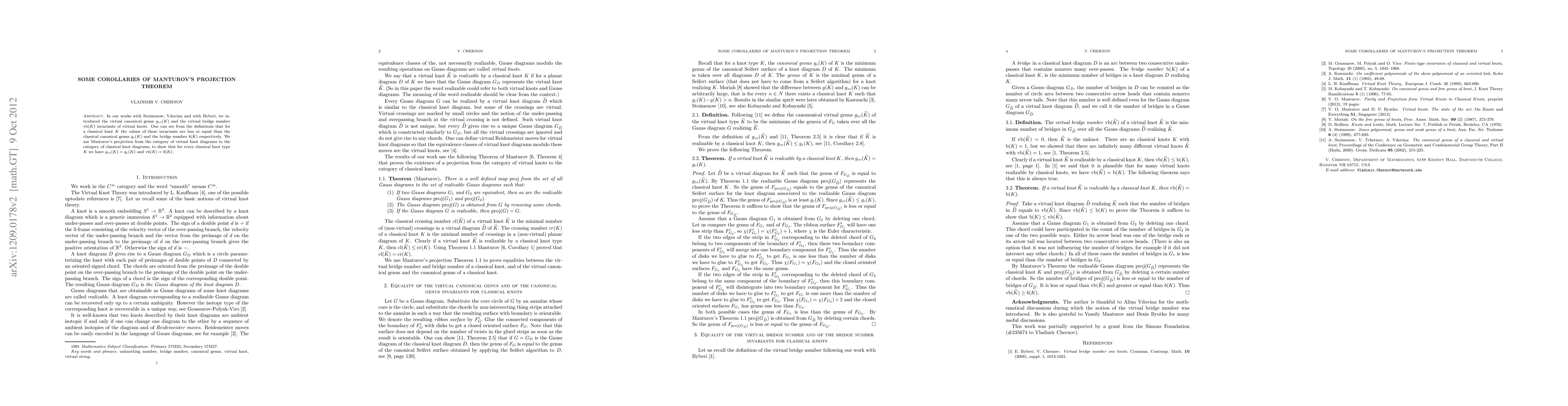 In our works with Stoimenow, Vdovina and with Byberi, we introduced the virtual canonical genus $g_{vc}(K)$ and the virtual bridge number $vb(K)$ invariants of virtual knots. One can see from the definitions that for an classical knot $K$ the values of these invariants are less or equal than the classical canonical genus $g_c(K)$ and the bridge number $b(K)$ respectively. We use Manturov's projection from the category of virtual knot diagrams to the category of classical knot diagrams, to show that for every classical knot type $K$ we have $g_{vc}(K)=g_c(K)$ and $vb(K)=b(K)$.