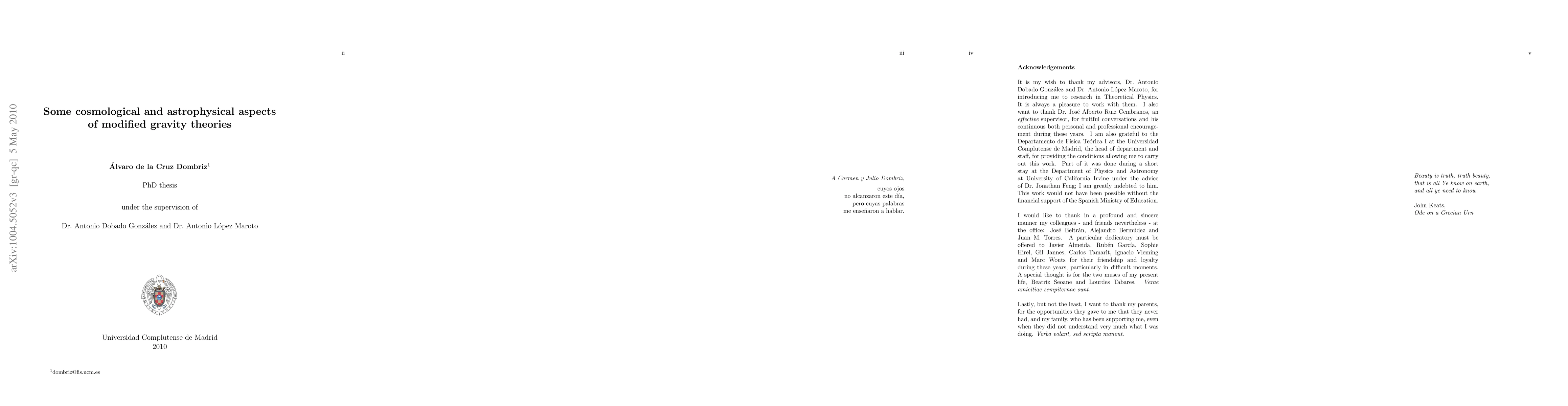 This thesis will try to contribute to the understanding of open issues in cosmology by considering f(R) and brane-world theories. In Chapter 1, we shall summarize the main features of f(R) gravities in the metric formalism and we shall introduce both the notion of brane excitations, the branons, and the brane-skyrmions. We shall finish the chapter by providing some insight about the possibility of mini black holes detection in the LHC as a signature for the validity of these modified gravity theories. The Chapter 2 will deal with f(R) theories able to mimic Einstein-Hilbert plus cosmological constant solutions and f(R) theories will be shown to be able to mimic the cosmological evolution generated by any perfect fluid with constant equation of state. The Chapter 3 will be devoted to the computation of cosmological perturbations for f(R) theories. Special attention will be paid here to obtain a completely general differential equation for the evolution of perturbations and its particularization for the so-called sub-Hubble scales will be explicitly shown. In the Chapter 4 we shall focus on the study of black holes in f(R) gravities in an arbitrary number of dimensions. With this purpose we shall study constant curvature solutions for f(R) theories as well as perturbative solutions around the standard SAdS geometry. An important part of this chapter will be then devoted to the thermodynamics of SAdS black holes in f(R) theories. In the Chapter 5 we will thoroughly study brane-skyrmions. In this context, the recent claim of detection of an unexpected feature in the CMB, referred to as the cold spot, will be explained as a topological defect on the brane in complete agreement with those calculations in the literature that tried to explain that cold spot as a texture of a NLSM. Main conclusions are summarized all together in Chapter 6 .