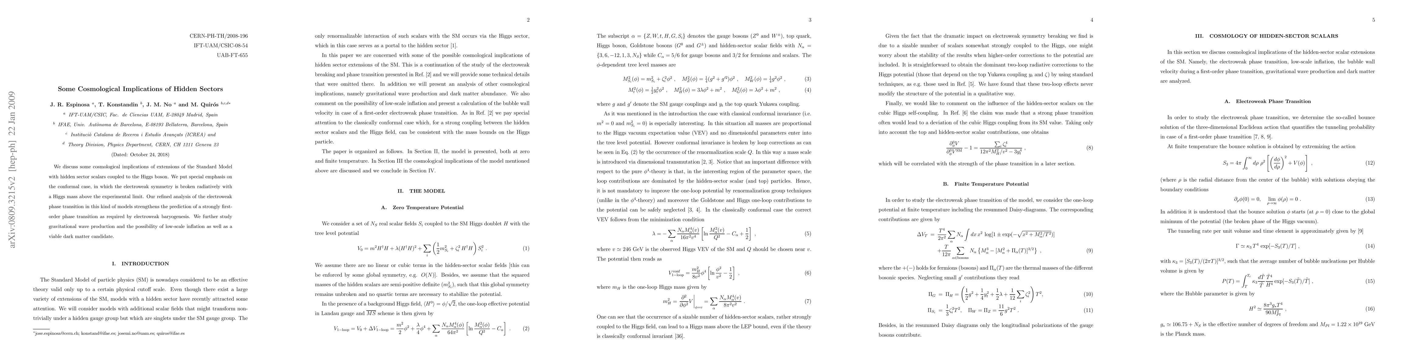We discuss some cosmological implications of extensions of the Standard Model with hidden sector scalars coupled to the Higgs boson. We put special emphasis on the conformal case, in which the electroweak symmetry is broken radiatively with a Higgs mass above the experimental limit. Our refined analysis of the electroweak phase transition in this kind of models strengthens the prediction of a strongly first-order phase transition as required by electroweak baryogenesis. We further study gravitational wave production and the possibility of low-scale inflation as well as a viable dark matter candidate.