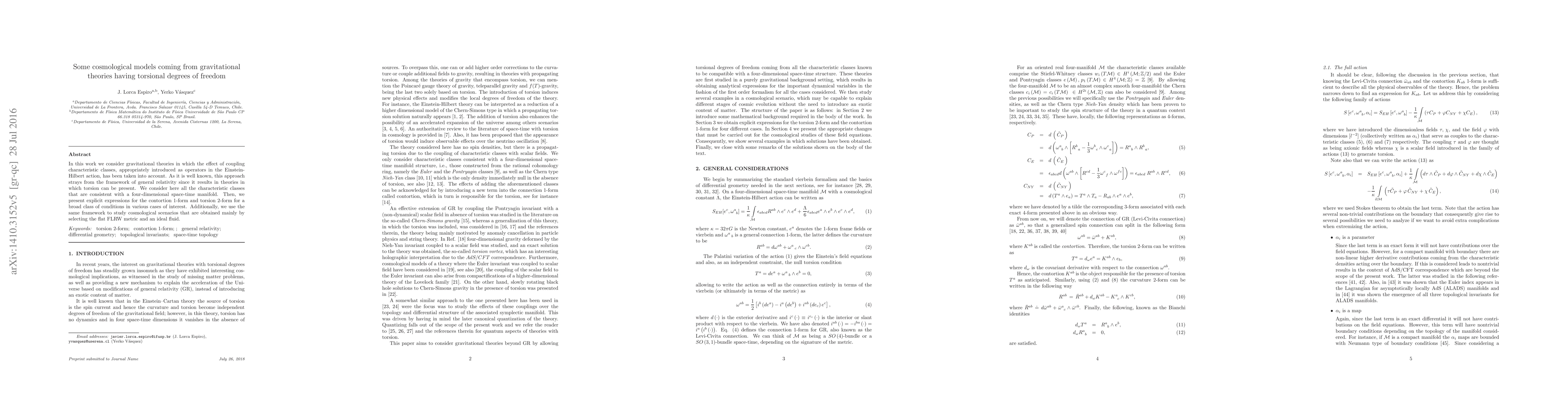 In this work we consider gravitational theories in which the effect of coupling characteristic classes, appropriately introduced as operators in the Einstein-Hilbert action, has been taken into account. As it is well known, this approach strays from the framework of general relativity since it results in theories in which torsion can be present. We consider here all the characteristic classes that are consistent with a four-dimensional space-time manifold. Then, we present explicit expressions for the contortion $1$-form and torsion $2$-form that can be obtained under general conditions in various cases of interest. Additionally, we use the same framework to study cosmological scenarios that are obtained mainly by selecting the flat FLRW metric and an ideal fluid.