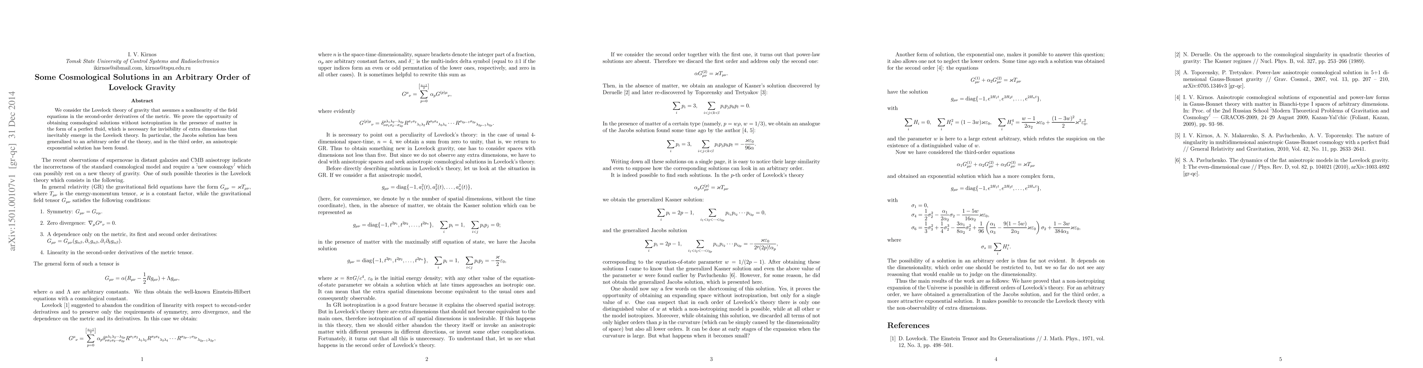 We consider the Lovelock theory of gravity that assumes a nonlinearity of the field equations in the second-order derivatives of the metric. We prove the opportunity of obtaining cosmological solutions without isotropization in the presence of matter in the form of a perfect fluid, which is necessary for invisibility of extra dimensions that inevitably emerge in the Lovelock theory. In particular, the Jacobs solution has been generalized to an arbitrary order of the theory, and in the third order, an anisotropic exponential solution has been found.