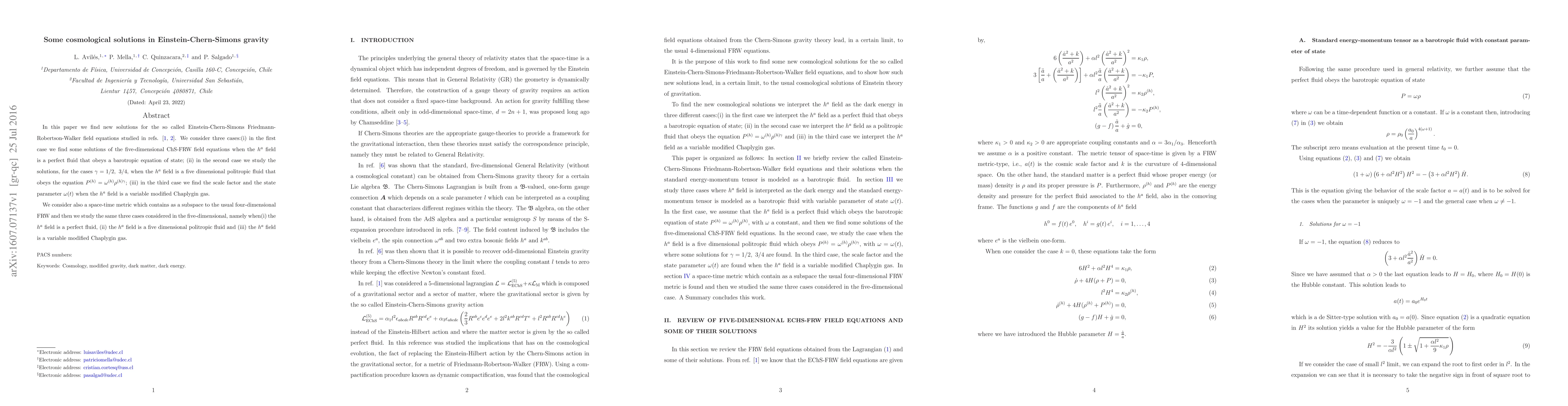 In this paper we find new solutions for the so called Einstein-Chern-Simons Friedmann-Robertson-Walker field equations studied in refs. (Phys. Rev. D 84 (2011) 063506, Eur. Phys. J. C 74 (2014) 3087). We consider three cases:(i) in the first case we find some solutions of the five-dimensional ChS-FRW field equations when the $h^a$ field is a perfect fluid that obeys a barotropic equation of state; (ii) in the second case we study the solutions, for the cases $\gamma =1/2,\ 3/4$, when the $h^a$ field is a five dimensional politropic fluid that obeys the equation $P^{(h)}=\omega ^{(h)}\rho ^{(h)\gamma }$; (iii) in the third case we find the scale factor and the state parameter $\omega (t)$ when the $h^a$ field is a variable modified Chaplygin gas. We consider also a space-time metric which contains as a subspace to the usual four-dimensional FRW and then we study the same three cases considered in the five-dimensional, namely when (i) the $h^a$ field is a perfect fluid, (ii) the $h^a$ field is a five dimensional politropic fluid and (iii) the $h^a$ field is a variable modified Chaplygin gas.