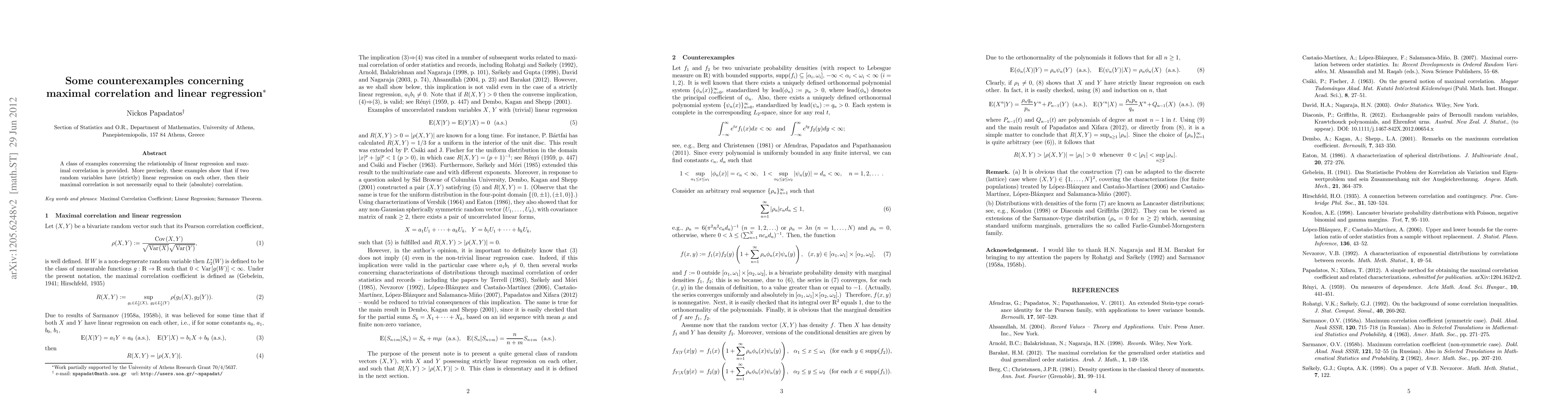 Summary: This paper presents examples illustrating that linear regression between two random variables does not guarantee that their maximal correlation is equal to their absolute correlation, challenging the assumption of their equivalence.