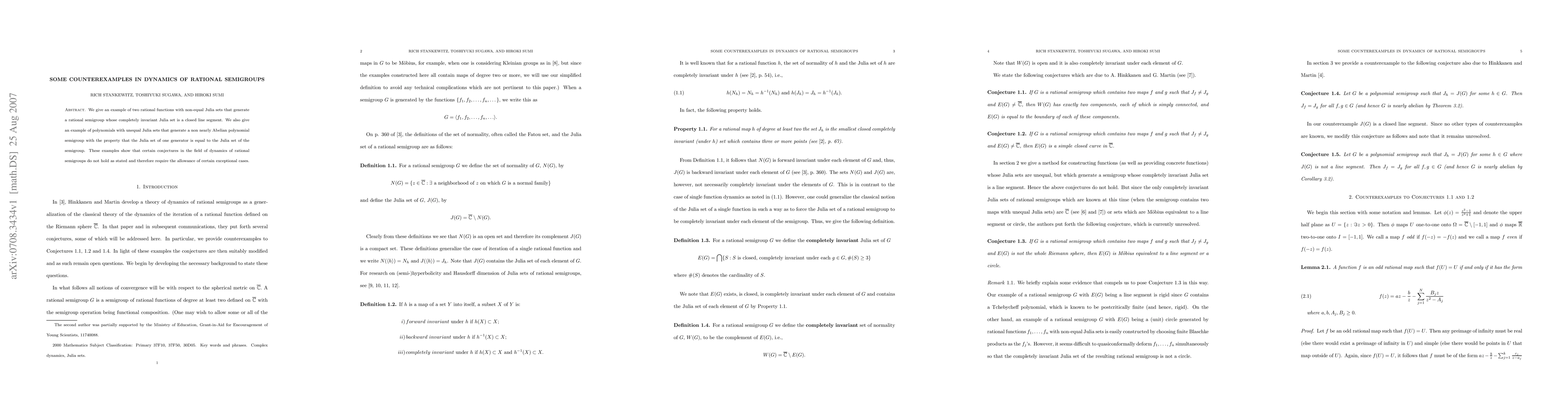 This paper presents counterexamples disproving conjectures in the dynamics of rational semigroups, showing that two rational functions can generate a semigroup with a completely invariant Julia set as a closed line segment despite having non-equal Julia sets. It also demonstrates a case where polynomials with unequal Julia sets form a non-nearly Abelian semigroup where one generator's Julia set equals the semigroup's Julia set.