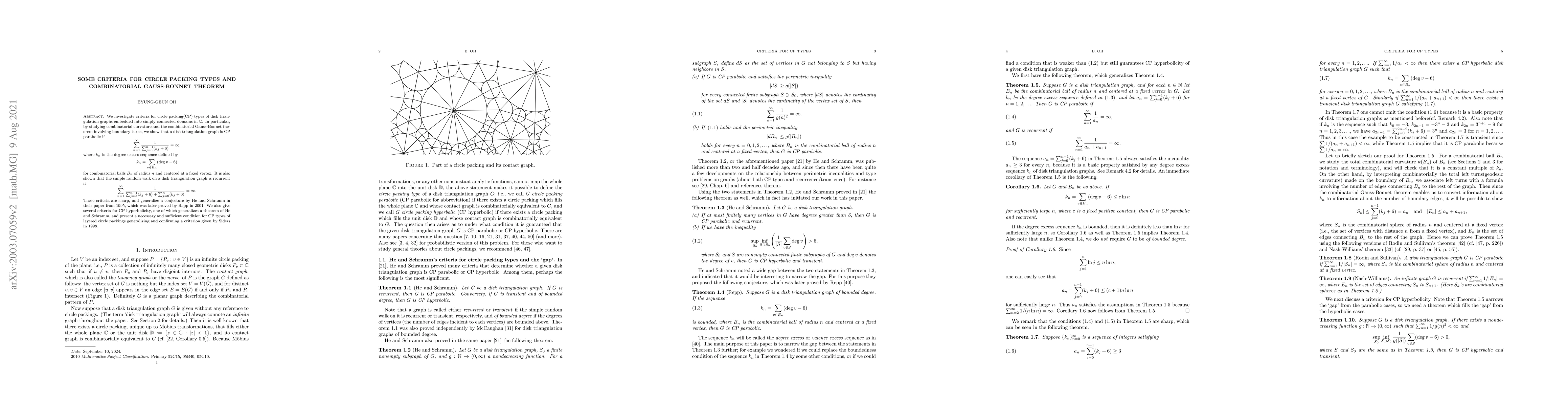 We investigate criteria for circle packing(CP) types of disk triangulation graphs embedded into simply connected domains in $ \mathbb{C}$. In particular, by studying combinatorial curvature and the combinatorial Gauss-Bonnet theorem involving boundary turns, we show that a disk triangulation graph is CP parabolic if \[ \sum_{n=1}^\infty \frac{1}{\sum_{j=0}^{n-1} (k_j +6)} = \infty, \] where $k_n$ is the degree excess sequence defined by \[ k_n = \sum_{v \in B_n} (\mbox{deg}\, v - 6) \] for combinatorial balls $B_n$ of radius $n$ and centered at a fixed vertex. It is also shown that the simple random walk on a disk triangulation graph is recurrent if \[ \sum_{n=1}^\infty \frac{1}{\sum_{j=0}^{n-1} (k_j +6)+\sum_{j=0}^{n} (k_j +6)} = \infty. \] These criteria are sharp, and generalize a conjecture by He and Schramm in their paper from 1995, which was later proved by Repp in 2001. We also give several criteria for CP hyperbolicity, one of which generalizes a theorem of He and Schramm, and present a necessary and sufficient condition for CP types of layered circle packings generalizing and confirming a criterion given by Siders in 1998.