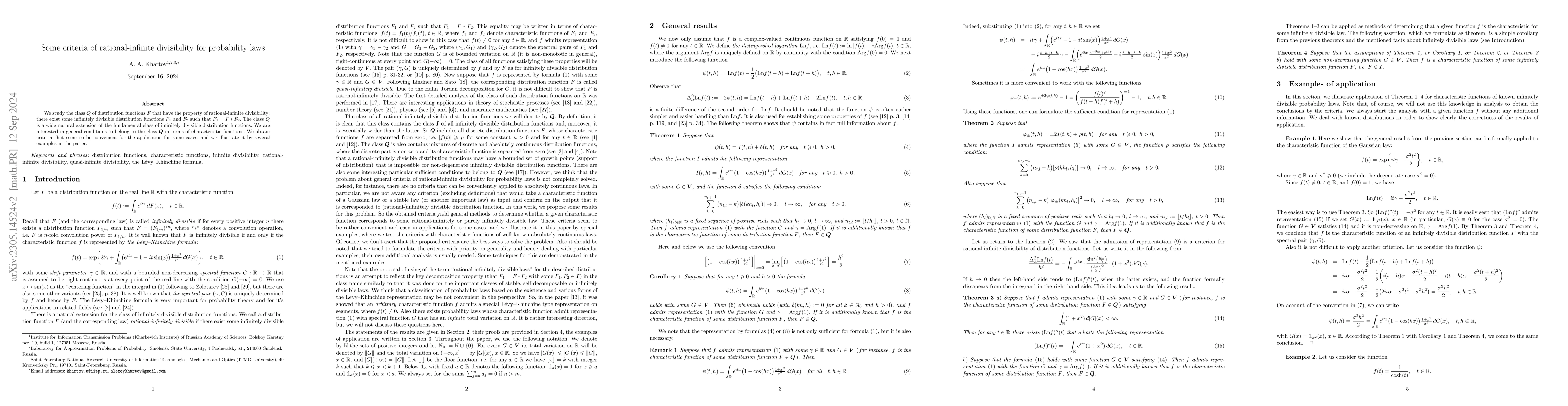 This paper explores distribution functions $F$ with rational infinite divisibility, identifying a class $\boldsymbol{Q}$ that extends infinitely divisible distributions. It provides criteria for membership in $\boldsymbol{Q}$, formulated in terms of characteristic functions, which are practical for application.