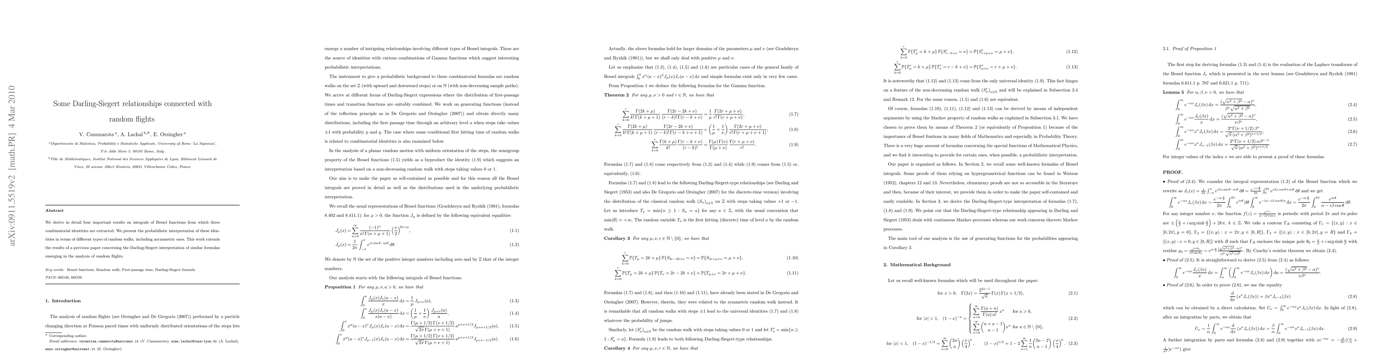 We derive in detail four important results on integrals of Bessel functions from which three combinatorial identities are extracted. We present the probabilistic interpretation of these identities in terms of different types of random walks, including asymmetric ones. This work extends the results of a previous paper concerning the Darling-Siegert interpretation of similar formulas emerging in the analysis of random flights.