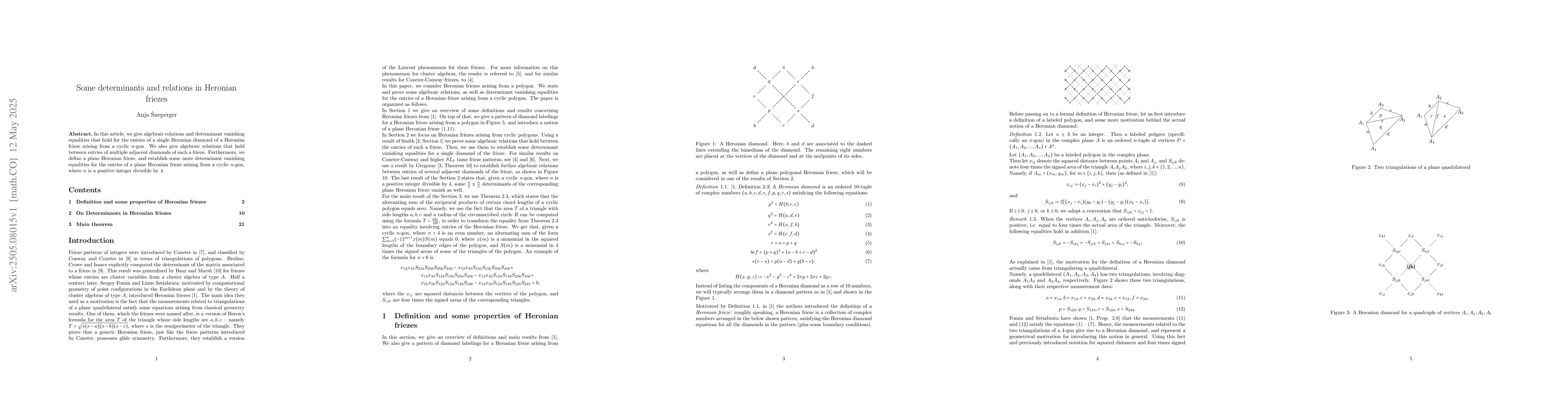 The paper presents algebraic relations and determinant vanishing equalities for Heronian diamonds within friezes derived from cyclic n-gons, extending to multiple adjacent diamonds and plane Heronian friezes for n divisible by 4.