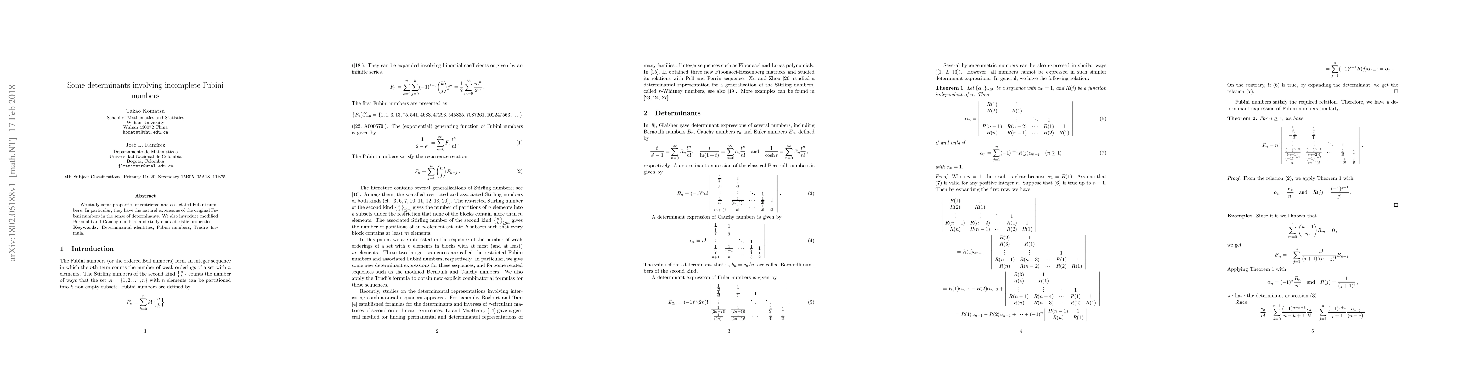 This paper investigates properties of restricted and associated Fubini numbers, extending the original Fubini numbers through determinantal expressions. It also introduces modified Bernoulli and Cauchy numbers, examining their characteristic properties.