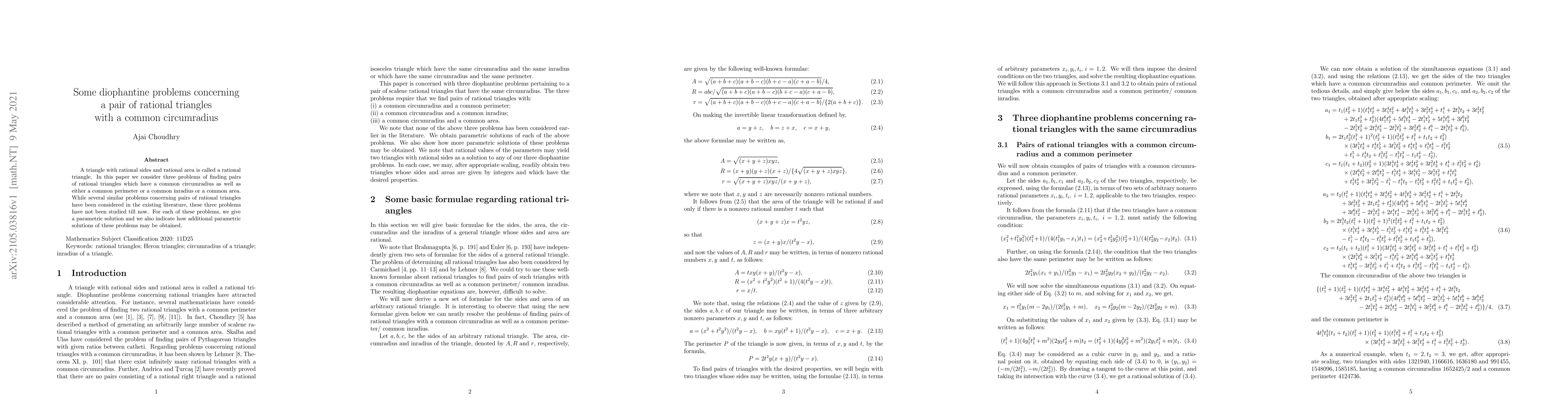 This paper solves three Diophantine problems related to rational triangles with a common circumradius, providing parametric solutions for each problem and suggesting additional methods to find more solutions.