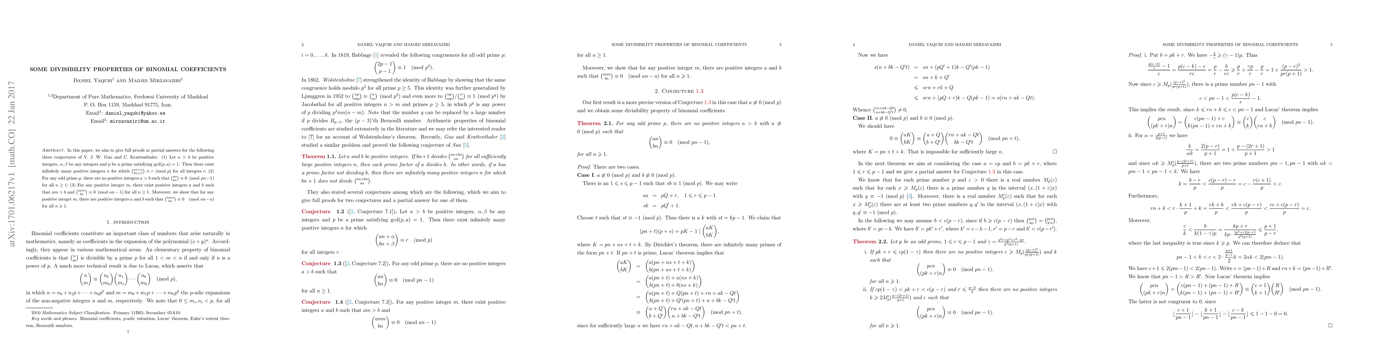Summary: This paper explores several divisibility properties of binomial coefficients, providing new insights into their behavior and relationships. The findings contribute to a deeper understanding of combinatorial number theory.