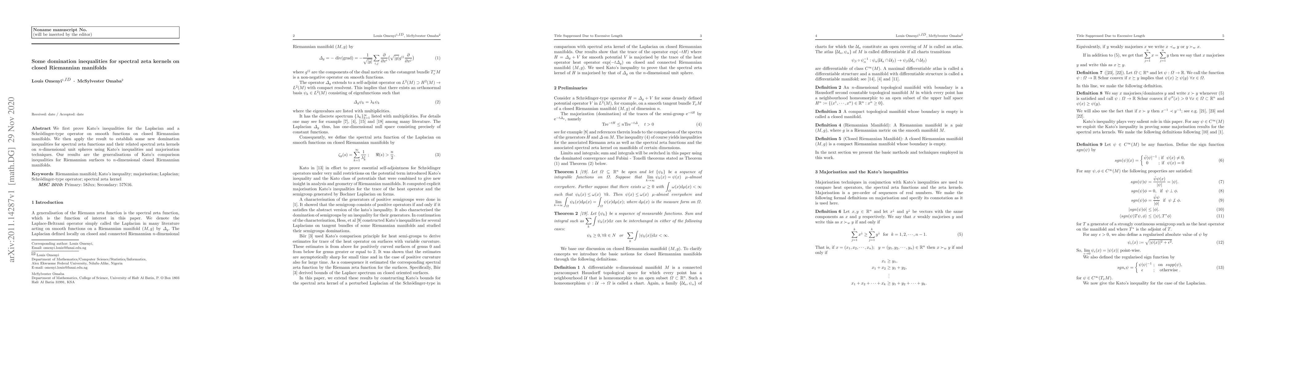 This paper proves Kato's inequalities for the Laplacian and Schrödinger-type operators on closed Riemannian manifolds and applies these results to establish new domination inequalities for spectral zeta functions and their kernels on $n$-dimensional unit spheres, generalizing the inequalities for Riemannian surfaces.