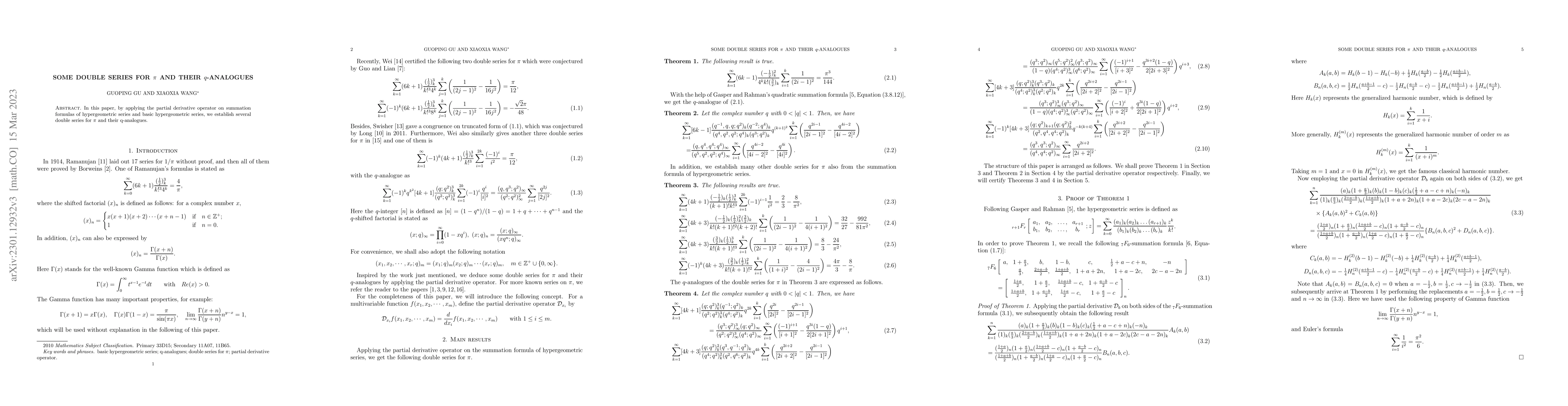 By applying the partial derivative operator to several summation formulas for hypergeometric series, we prove several double series for $\pi$ in this paper. Similarly, we also establish several $q$-analogues of them.