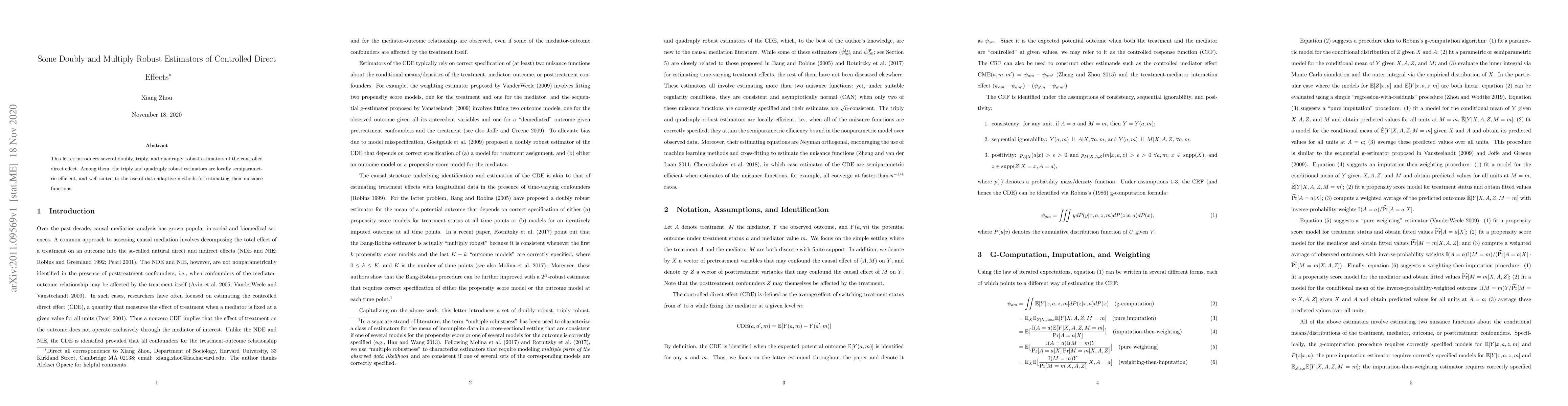 This paper presents various robust estimators for controlled direct effects, including triply and quadruply robust versions that are locally semiparametric efficient, ideal for data-adaptive methods to estimate their nuisance functions.