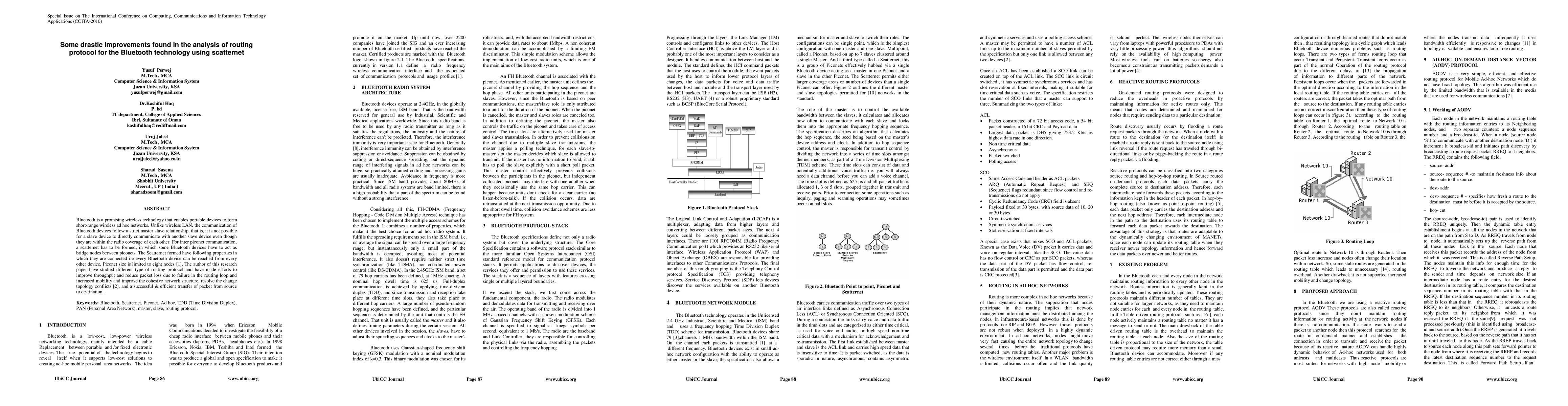 Bluetooth is a promising wireless technology that enables portable devices to form short-range wireless ad hoc networks. Unlike wireless LAN, the communication of Bluetooth devices follow a strict master slave relationship, that is, it is not possible for a slave device to directly communicate with another slave device even though they are within the radio coverage of each other. For inter piconet communication, a scatternet has to be formed, in which some Bluetooth devices have to act as bridge nodes between piconets. The Scatternet formed have following properties in which they are connected i.e every Bluetooth device can be reached from every other device, Piconet size is limited to eight nodes [1]. The author of this research paper have studied different type of routing protocol and have made efforts to improve throughput and reduce packet loss due to failure in the routing loop and increased mobility and improve the cohesive network structure, resolve the change topology conflicts [2], and a successful & efficient transfer of packet from source to destination.