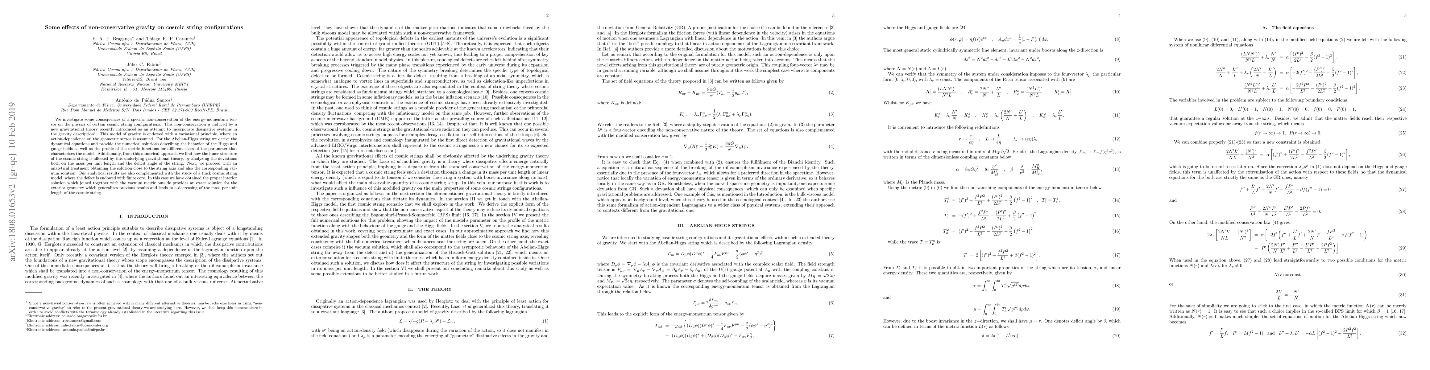 We investigate some consequences of a specific non-conservation of the energy-momentum tensor on the physics of certain cosmic string configurations. This non-conservation is induced by a new gravitational theory recently introduced as an attempt to incorporate dissipative systems in the gravity description. This model of gravity is endowed with a variational principle, where an action-dependence on the geometric sector is assumed. For the Abelian-Higgs string we derive the dynamical equations and provide the numerical solutions describing the behavior of the Higgs and gauge fields as well as the profile of the metric functions for different cases of the parameter that characterises the model. Additionally, from this numerical approach we find how the inner structure of the cosmic string is affected by this underlying gravitational theory, by analyzing the deviations both on the mass per unit length and the deficit angle of the string. Next, we proceed with an analytical treatment obtaining the solution close to the string axis and also the corresponding vacuum solution. Our analytical results are also complemented with the study of a thick cosmic string model, where the defect is endowed with finite core. In this case we have obtained the proper interior solution which joined together with the vacuum metric outside provides an exact solution for the exterior geometry which generalizes previous results and leads to a decreasing of the mass per unit length of the cosmic string.