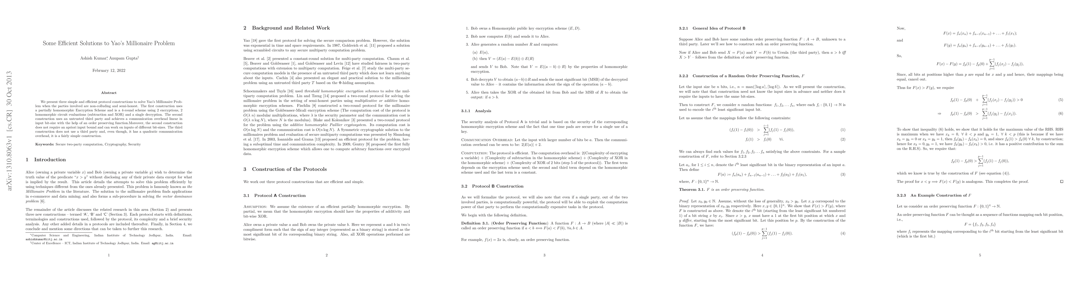 This paper proposes three efficient protocols for Yao's Millionaire Problem, focusing on non-colluding, semi-honest parties. The first uses a 4-round scheme with homomorphic encryption, the second employs an untrusted third party with linear communication overhead, and the third is simple but has quadratic communication overhead.
