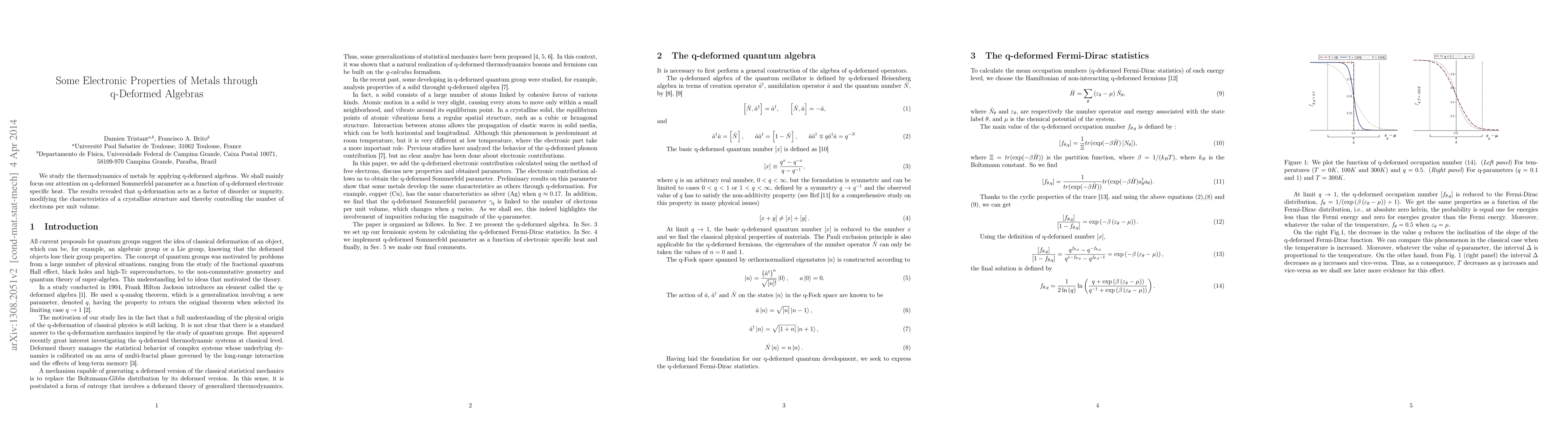 We study the thermodynamics of metals by applying q-deformed algebras. We shall mainly focus our attention on q-deformed Sommerfeld parameter as a function of q-deformed electronic specific heat. The results revealed that q-deformation acts as a factor of disorder or impurity, modifying the characteristics of a crystalline structure and thereby controlling the number of electrons per unit volume.