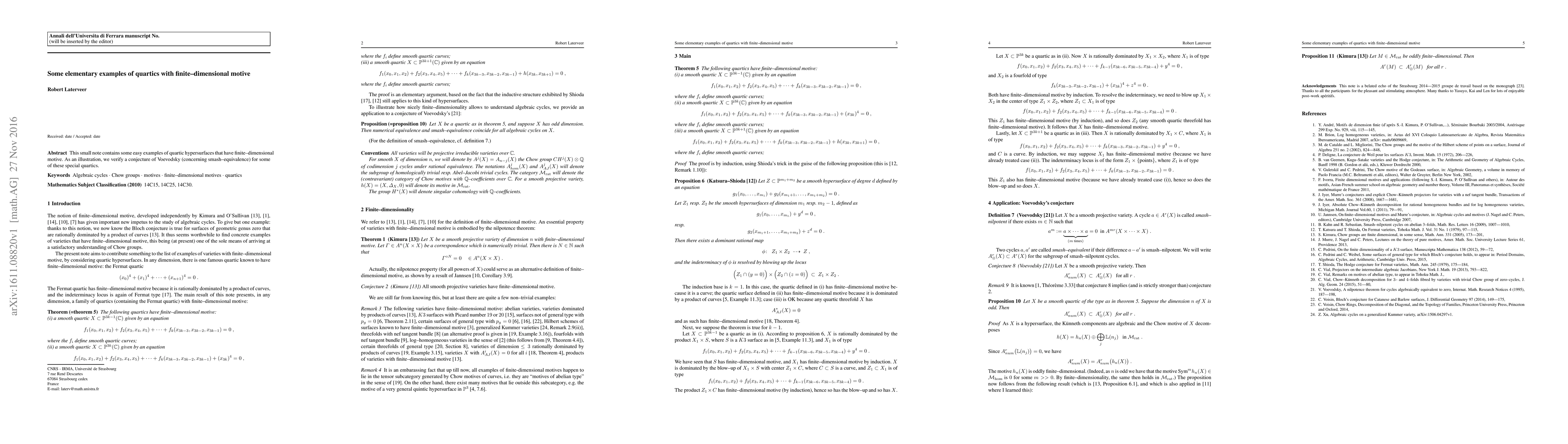 This small note contains some easy examples of quartic hypersurfaces that have finite-dimensional motive. As an illustration, we verify a conjecture of Voevodsky (concerning smash-equivalence) for some of these special quartics.