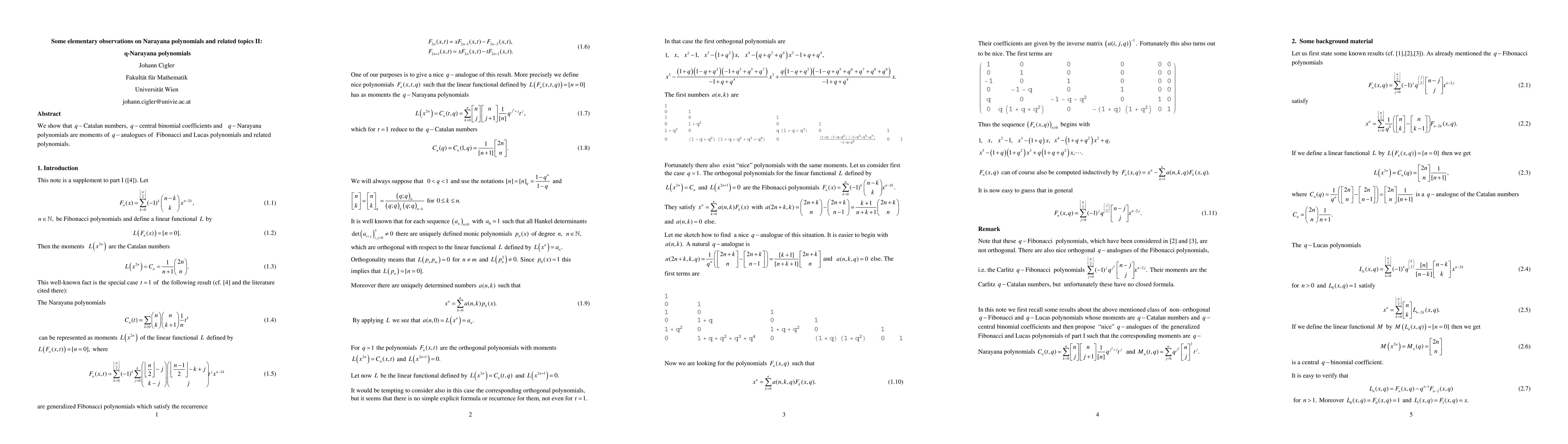 Summary: This paper demonstrates connections between q-Catalan numbers, q-central binomial coefficients, and q-Narayana polynomials, showing they are moments of q-analogues of Fibonacci and Lucas polynomials. These relationships provide insights into combinatorial structures and their algebraic properties.